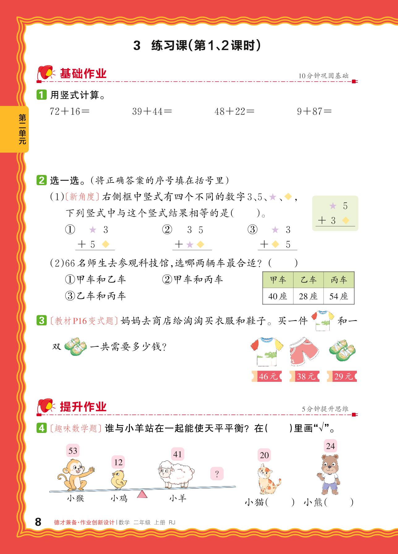 2024秋上册二年级数学人教版 第二单元 100以内的加法和减法(二)——3. 加法练习课