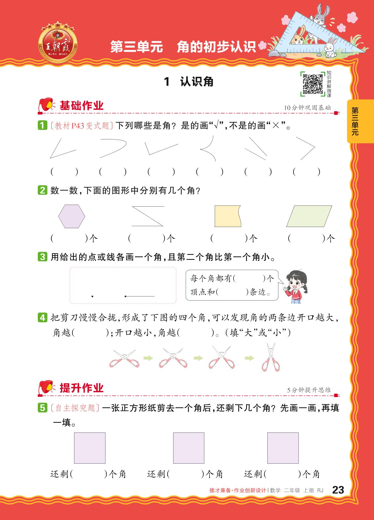 2024秋上册二年级数学人教版 第三单元 角的初步认识——1. 认识角