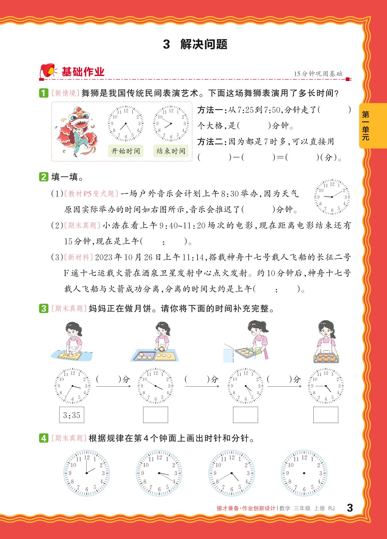 2024秋上册三年级数学人教版 第一单元 时、分、秒——3. 解决问题
