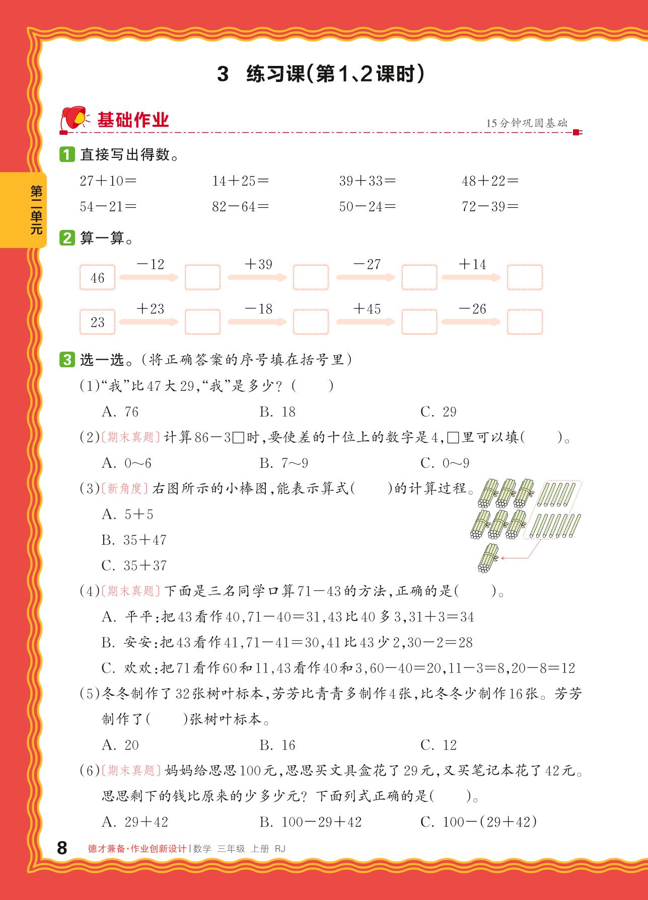 2024秋上册三年级数学人教版 第二单元 万以内的加法和减法(一)——3. 两位数加两位数、两位数减两位数练习课