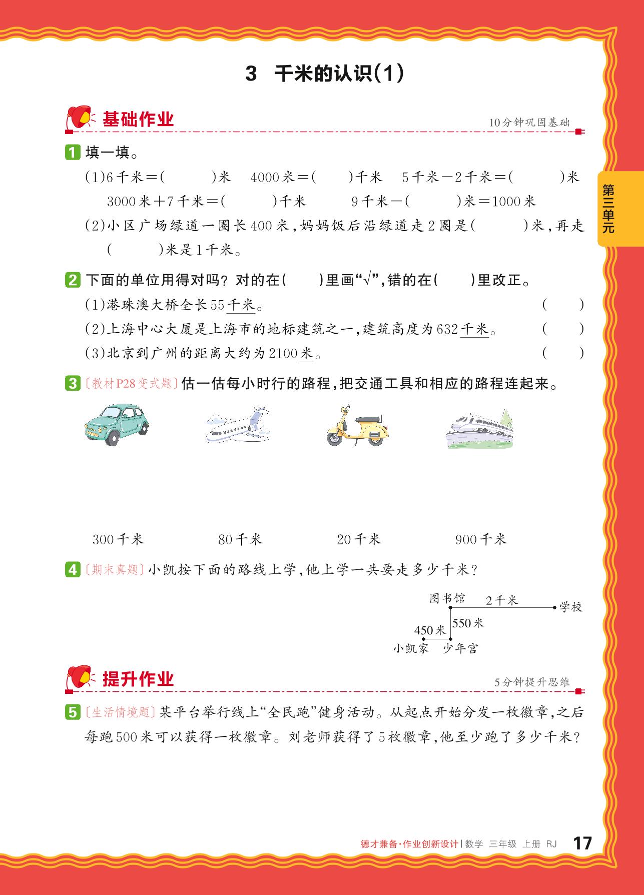 2024秋上册三年级数学人教版 第三单元 测量——3. 千米的认识(1)