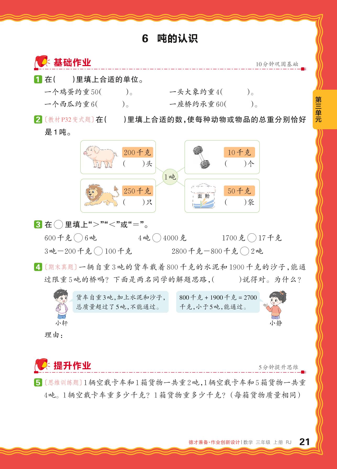 2024秋上册三年级数学人教版 第三单元 测量——6. 吨的认识