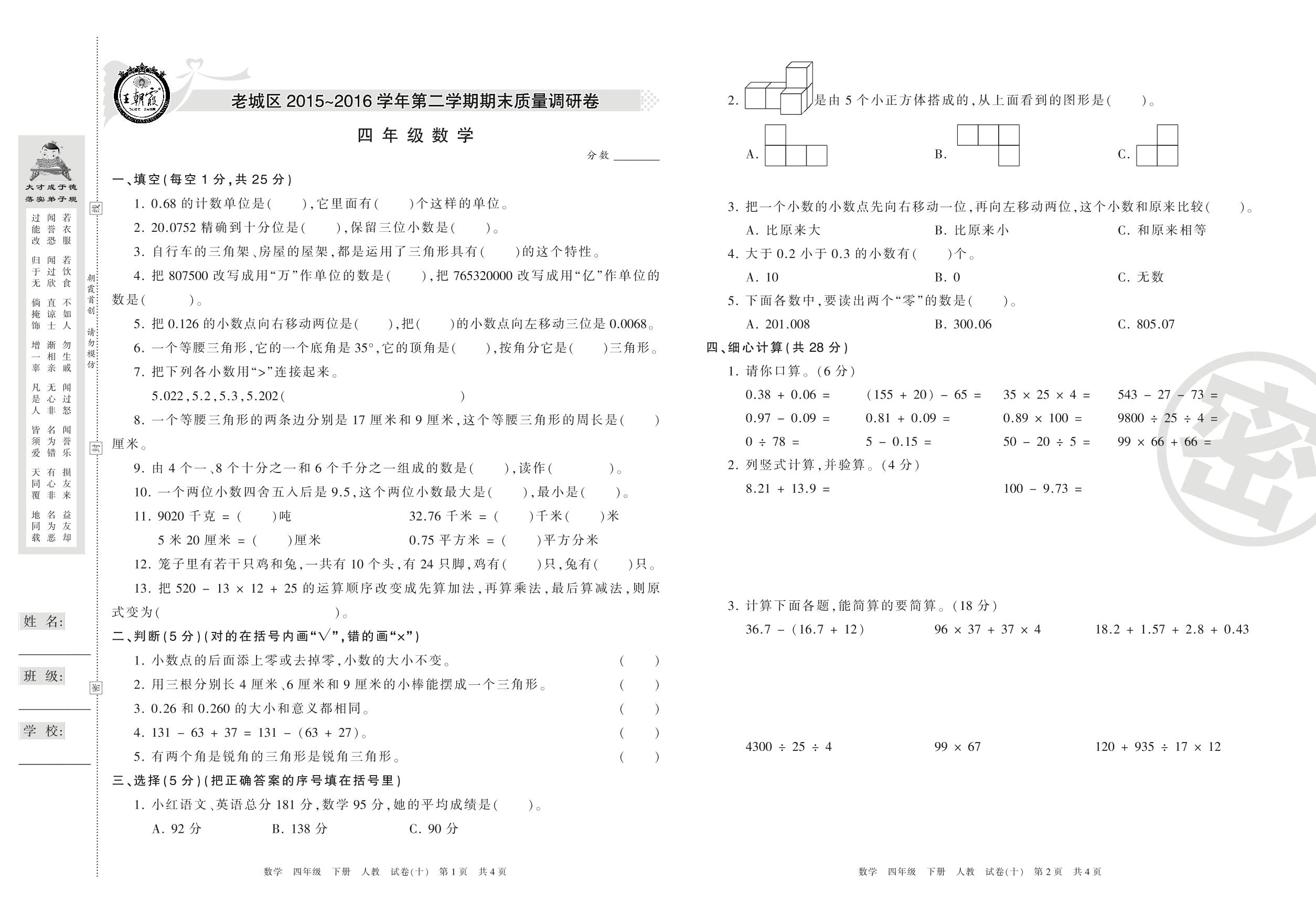 2015-2016学年第二学期洛阳市老城区四年级数学试卷(人教版)【10】