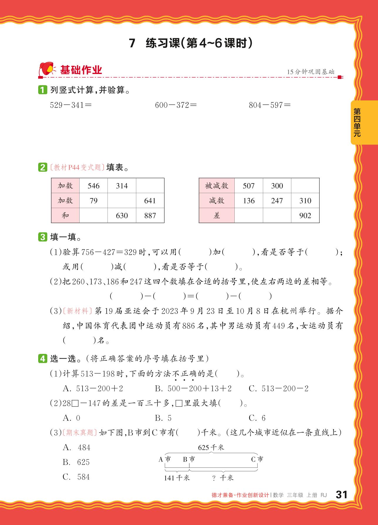 2024秋上册三年级数学人教版 第四单元 万以内的加法和减法(二)——7. 三位数减三位数练习课