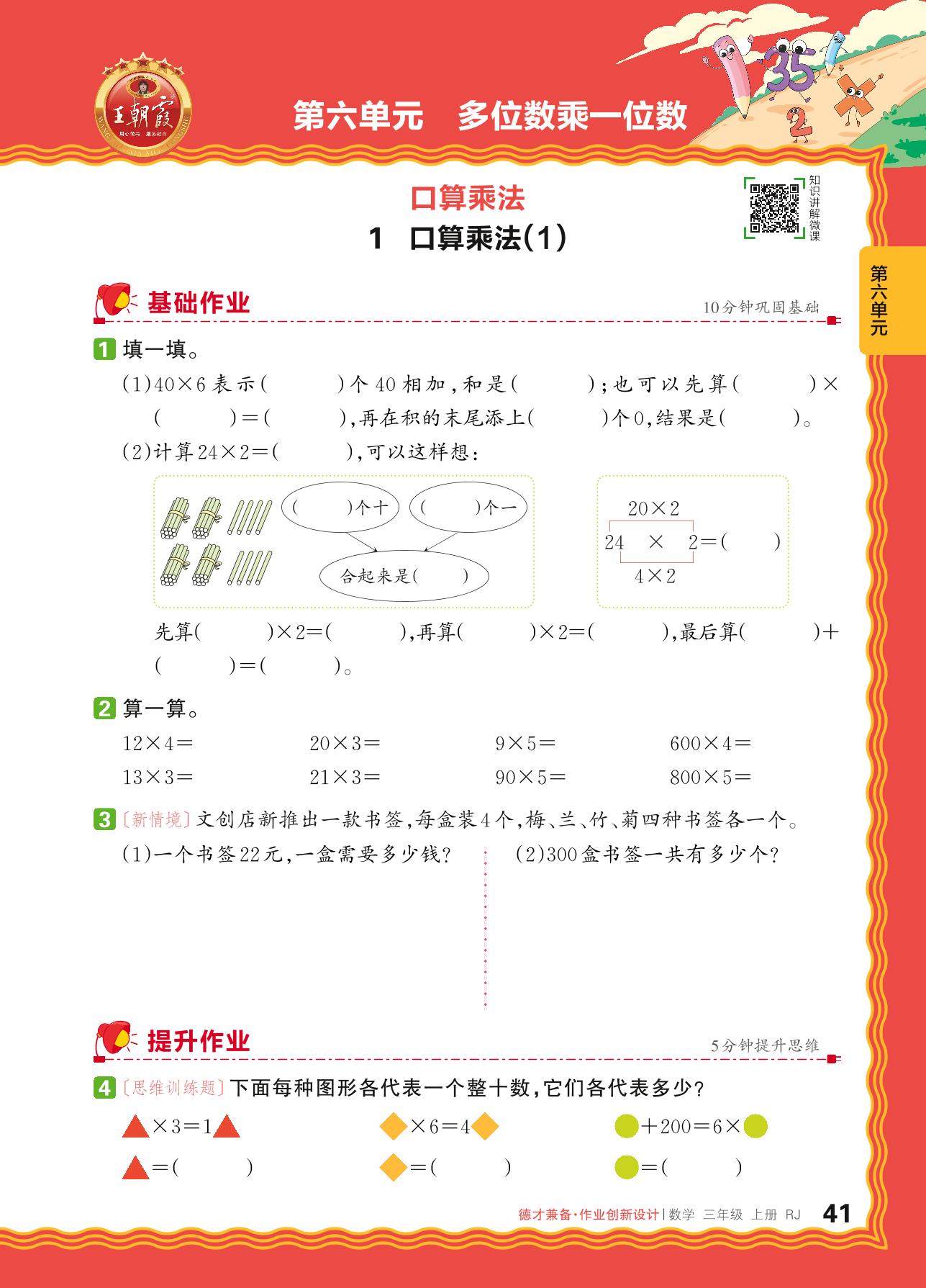 2024秋上册三年级数学人教版 第六单元 多位数乘一位数——1. 口算乘法(1)