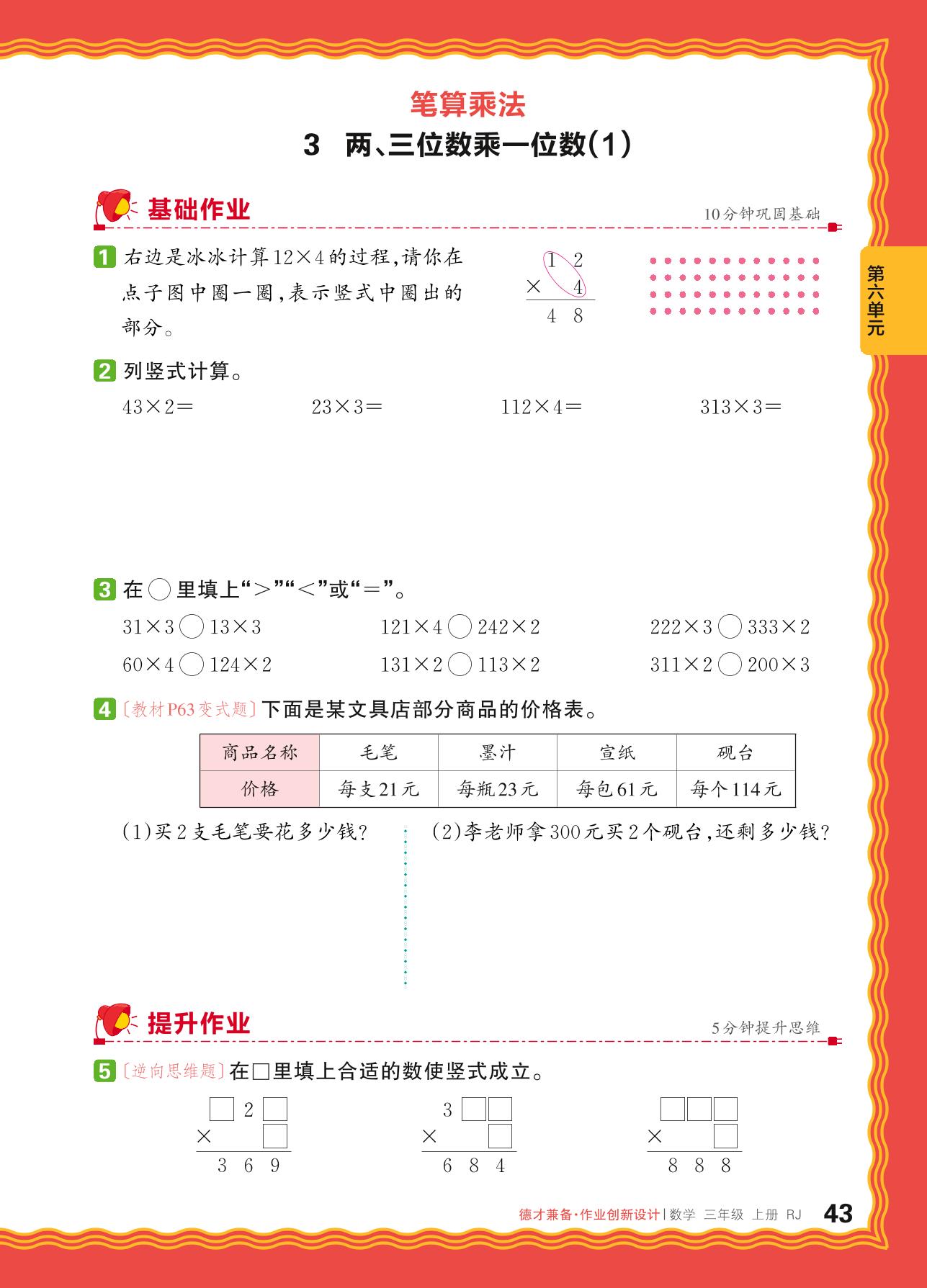 2024秋上册三年级数学人教版 第六单元 多位数乘一位数——3. 两、三位数乘一位数(1)