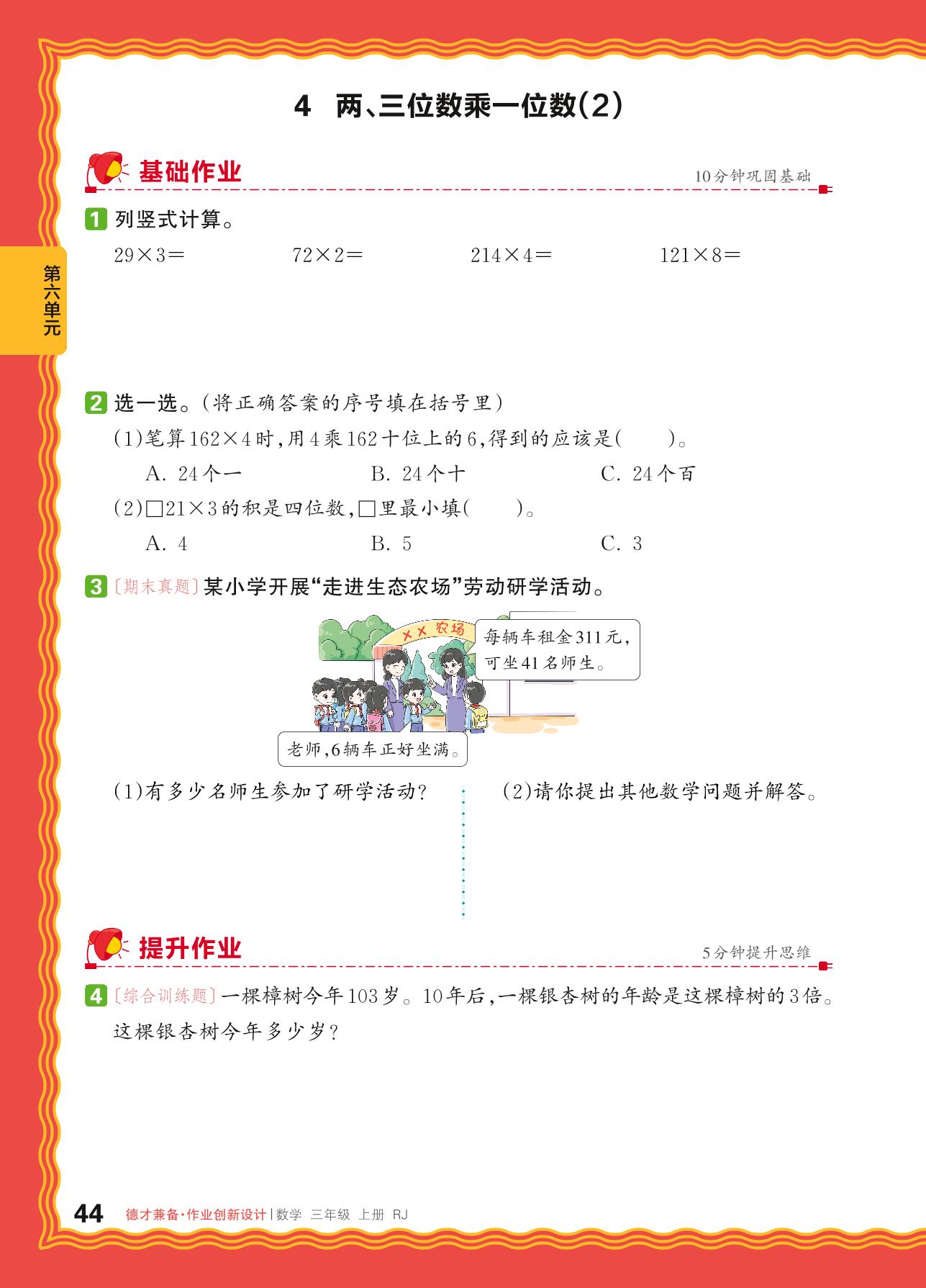 2024秋上册三年级数学人教版 第六单元 多位数乘一位数——4. 两、三位数乘一位数(2)
