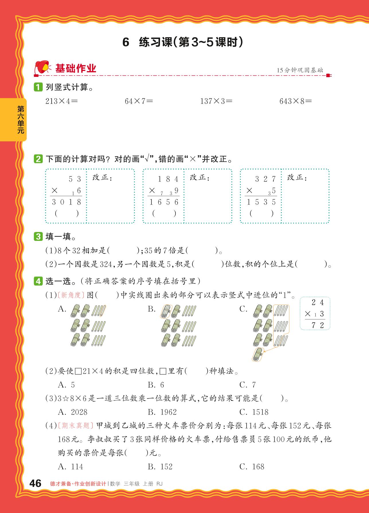2024秋上册三年级数学人教版 第六单元 多位数乘一位数——6. 两、三位数乘一位数练习课