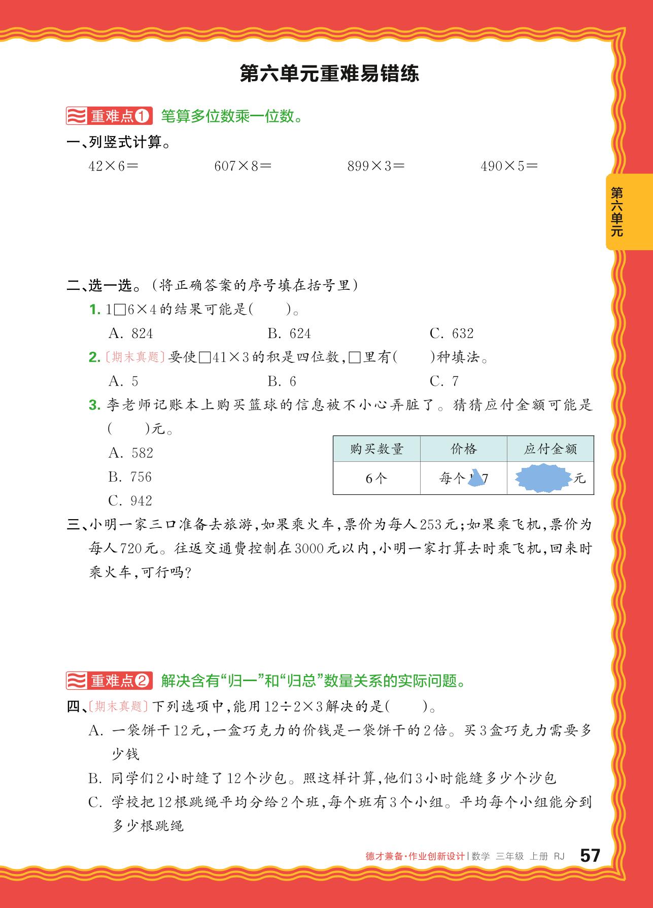 2024秋上册三年级数学人教版 第六单元重难易错练