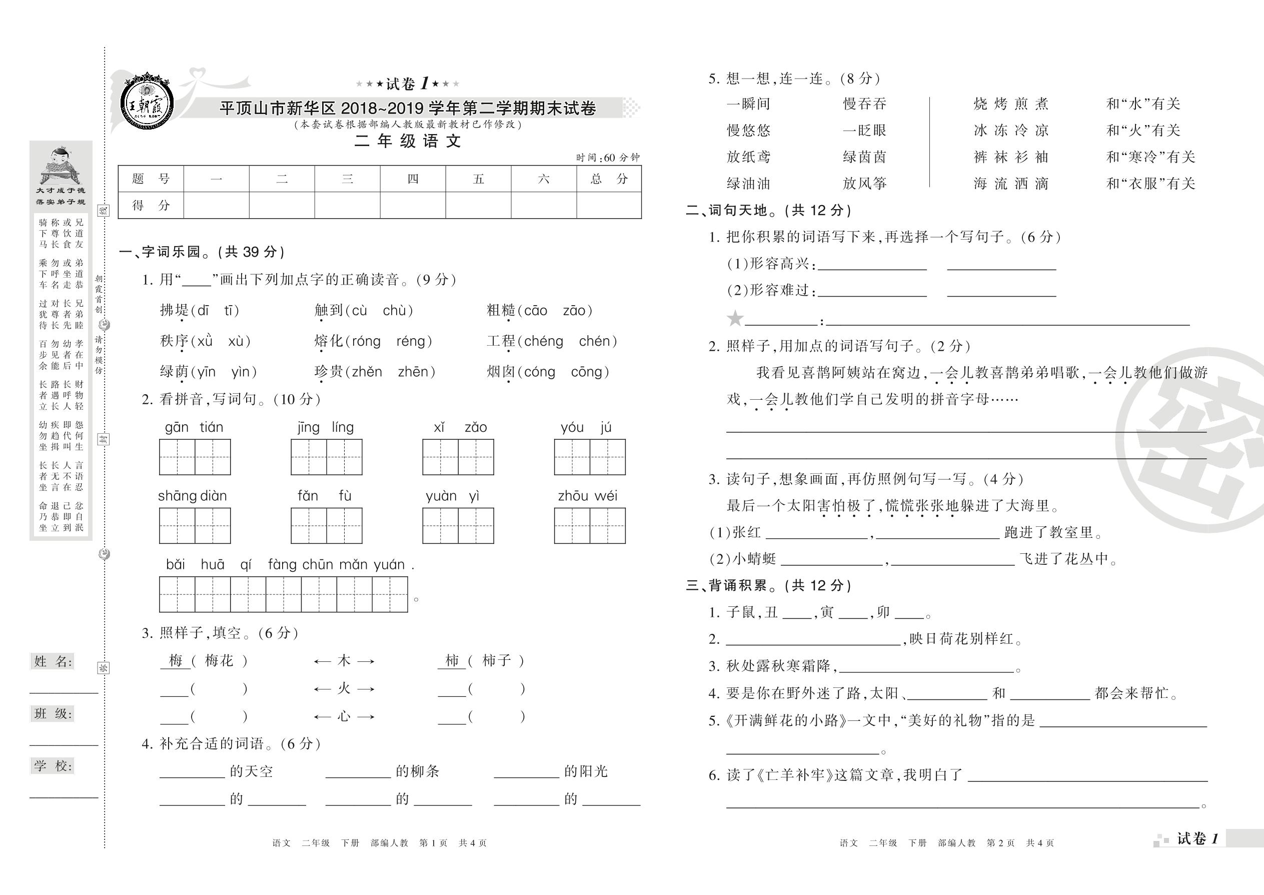 2018-2019学年第二学期平顶山市新华区二年级语文试卷(人教版)【1】