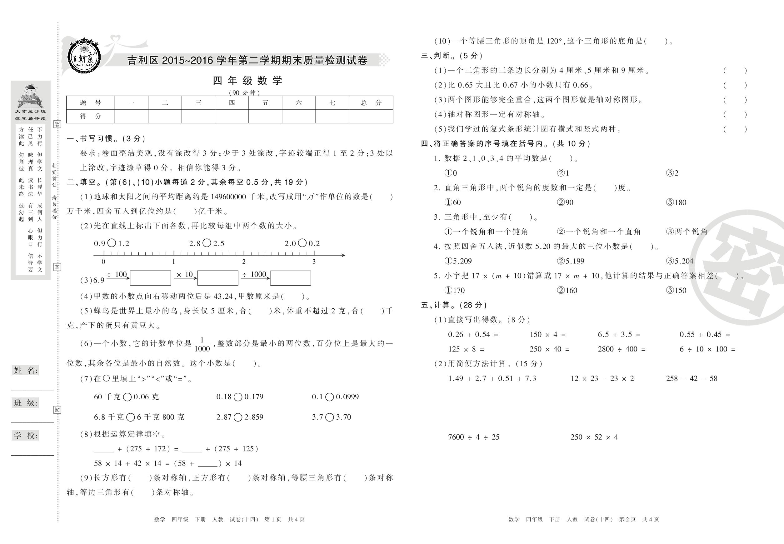 2015-2016学年第二学期洛阳市吉利区四年级数学试卷(人教版)【14】