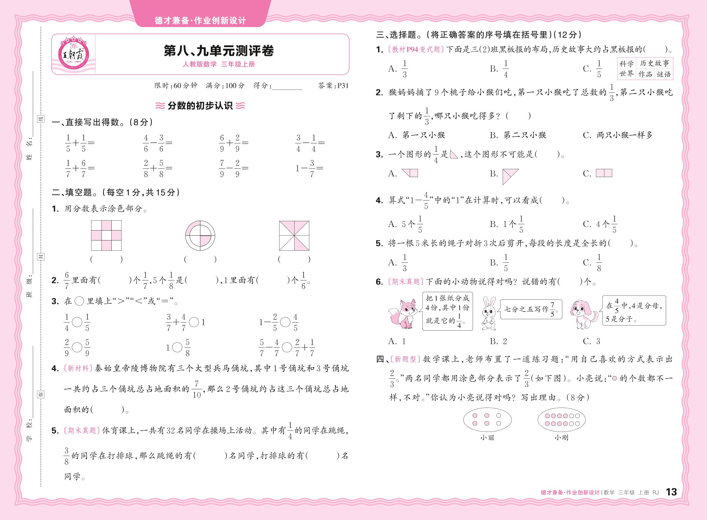 2024秋上册三年级数学人教版 第八、九单元测评卷