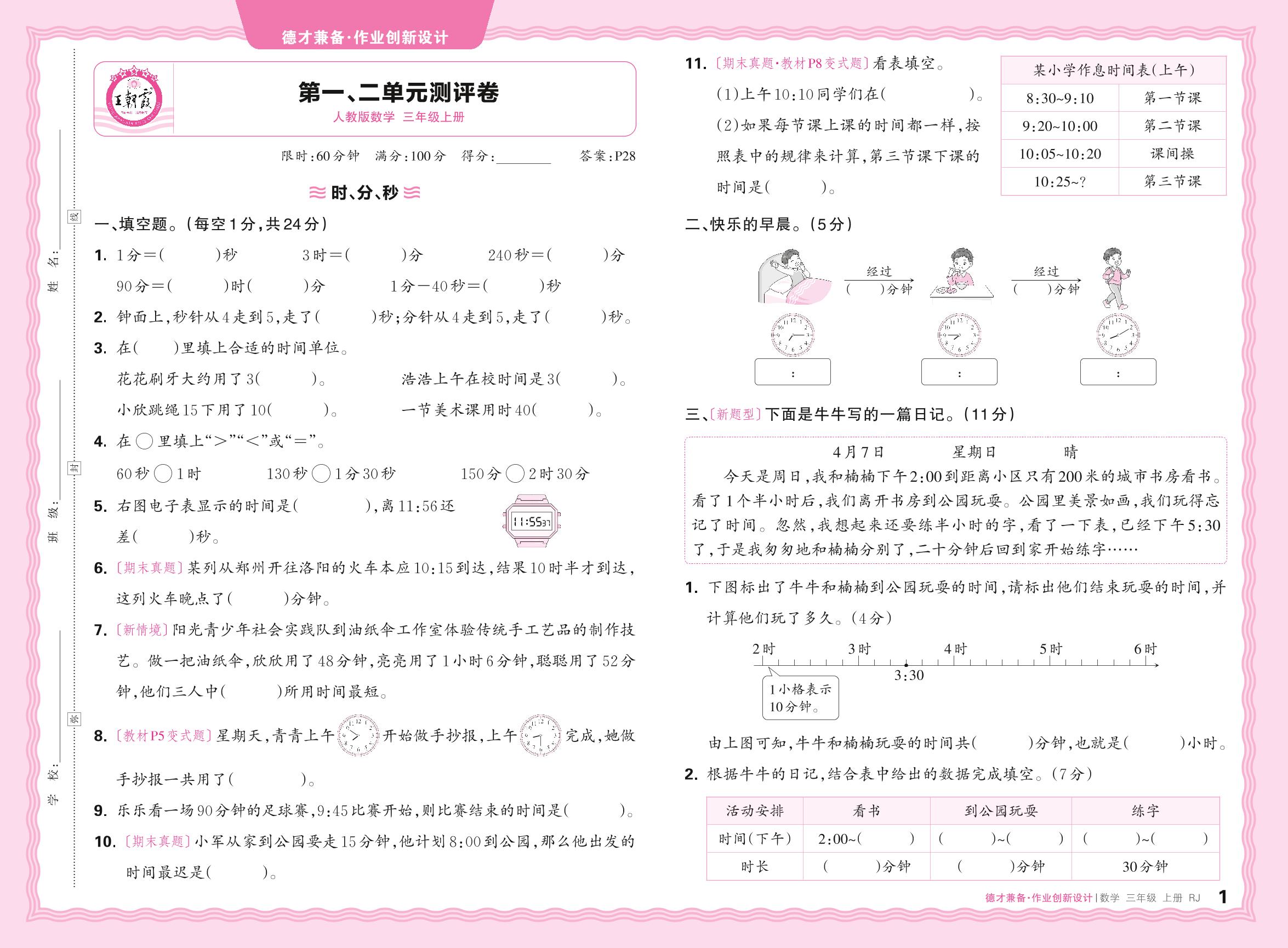 2024秋上册三年级数学人教版 第一、二单元测评卷