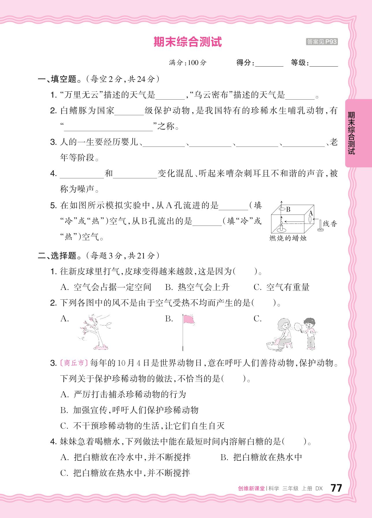 2024秋上册三年级科学大象版 期末综合测试_R240816095648455