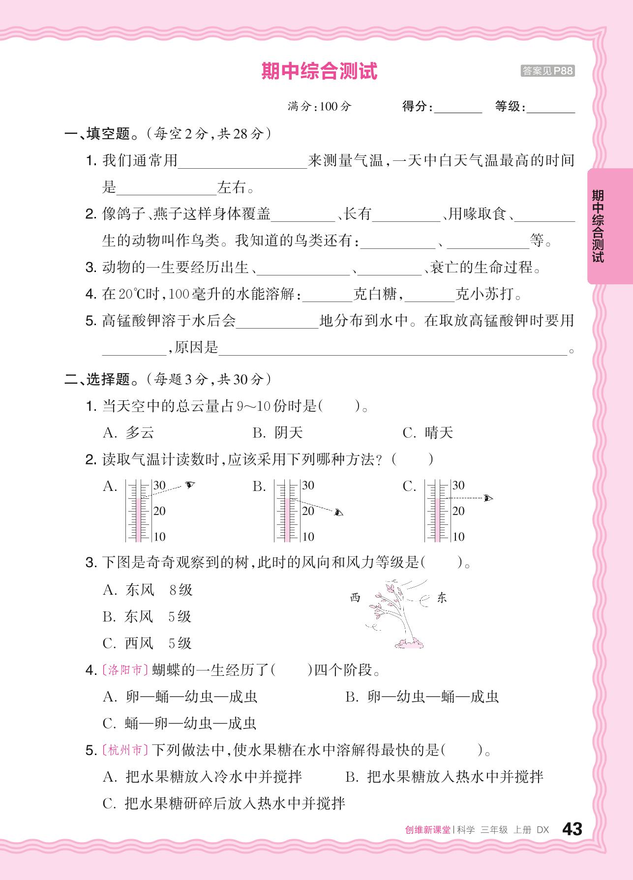 2024秋上册三年级科学大象版 期中综合测试_R240816095648018