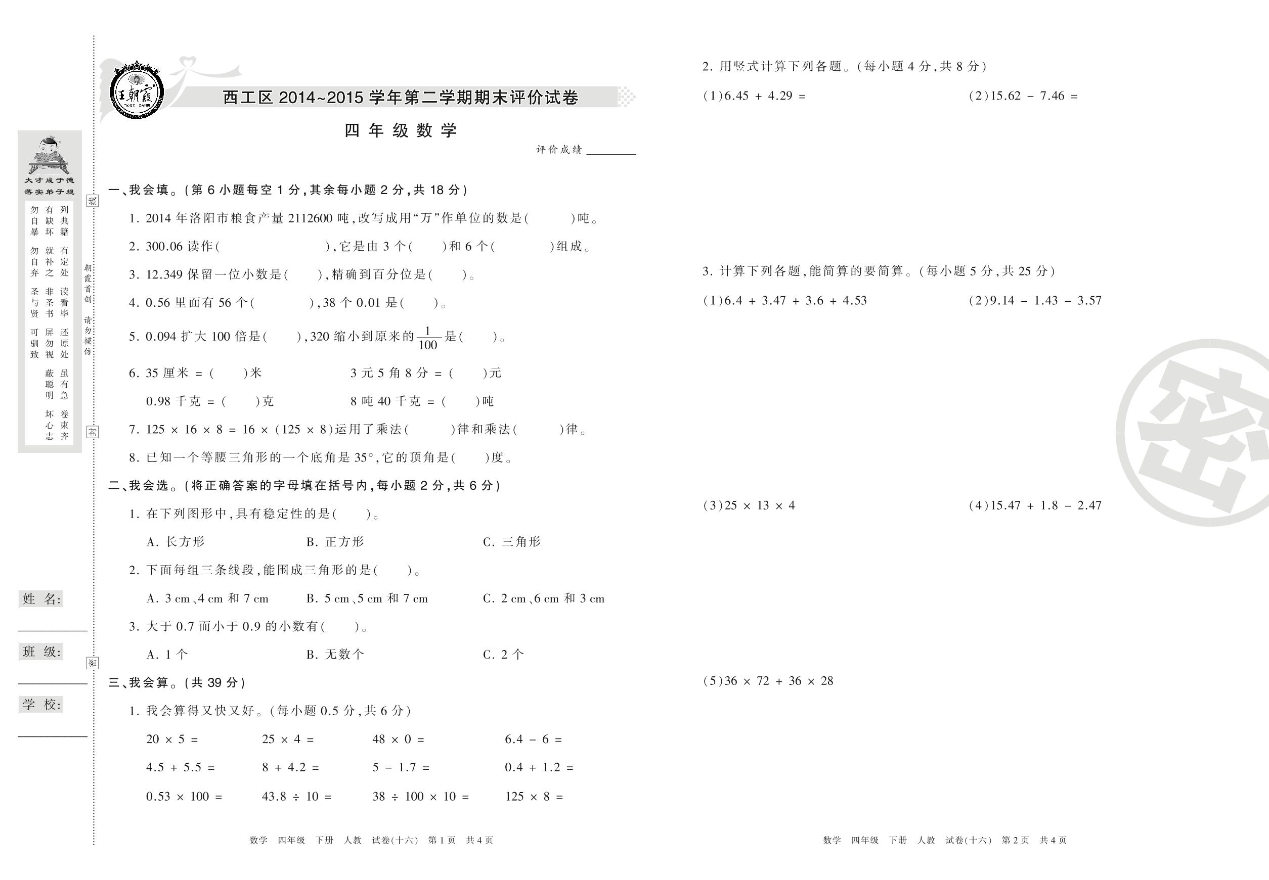 2014-2015学年第二学期洛阳市西工区四年级数学试卷(人教版)【16】