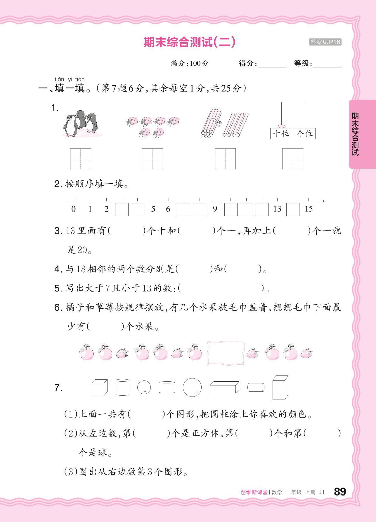 2024秋上册一年级数学冀教版 期末综合测试(二)