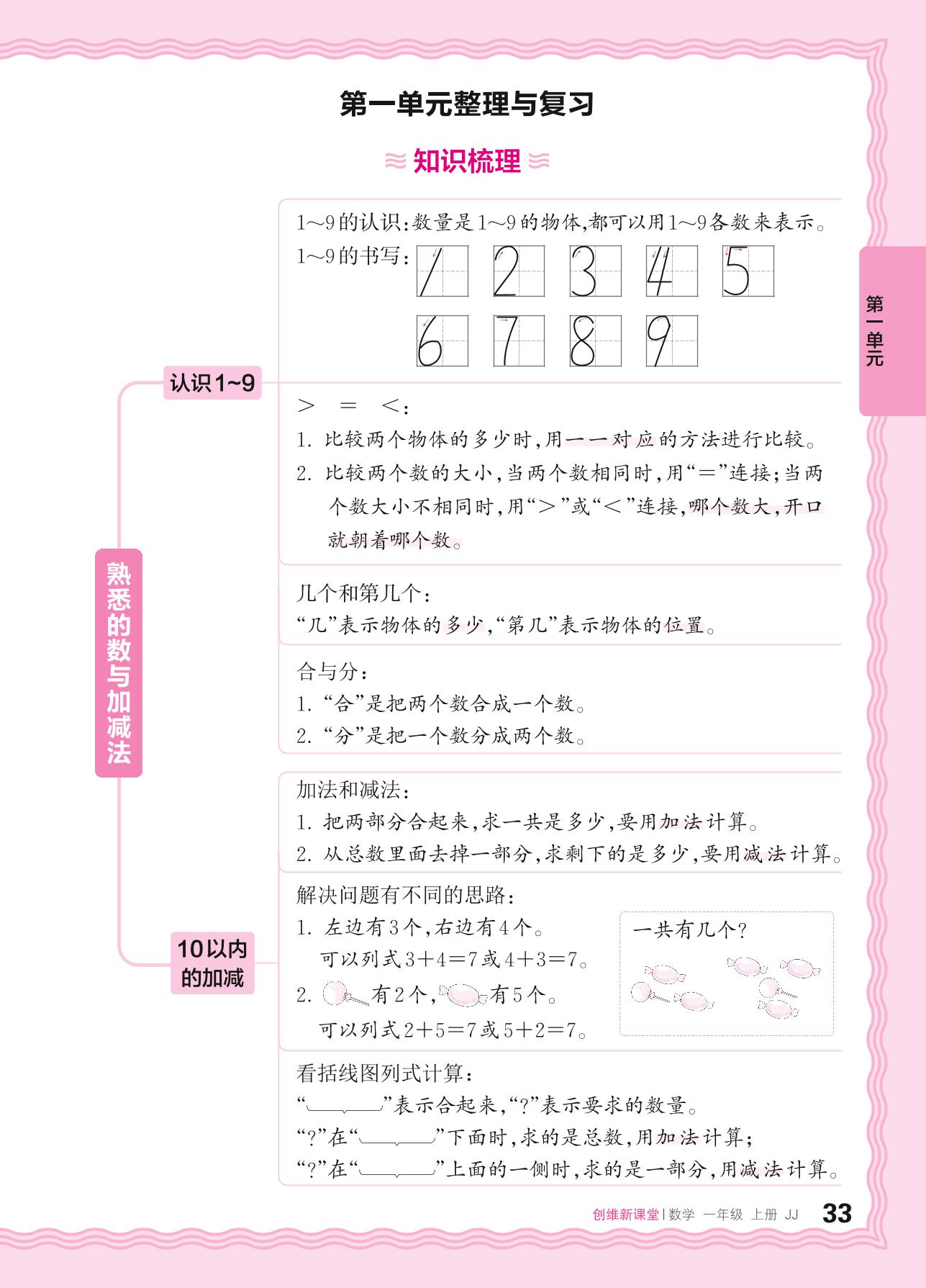 2024秋上册一年级数学冀教版 第一单元整理与复习