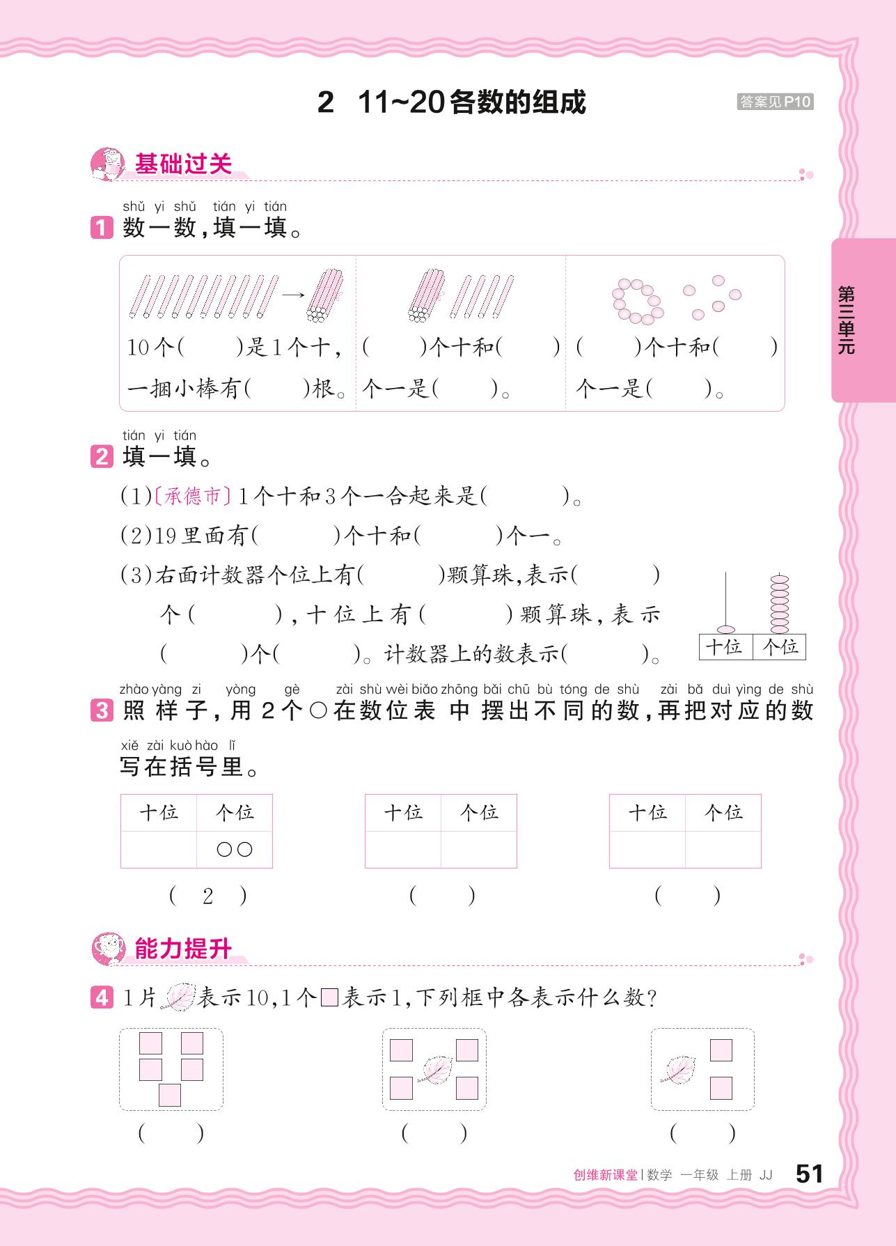 2024秋上册一年级数学冀教版 第三单元 认识11~20——2. 11~20各数的组成