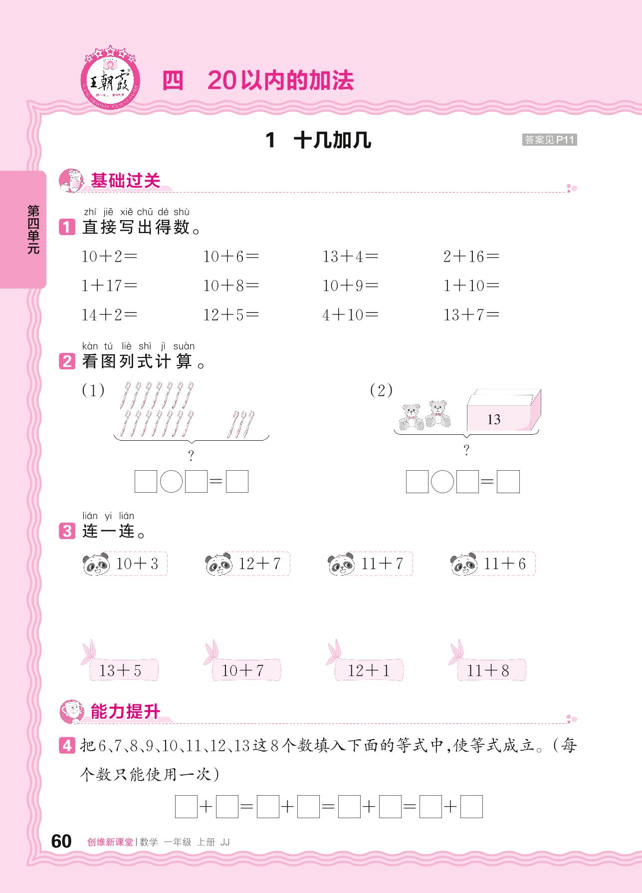 2024秋上册一年级数学冀教版 第四单元 20以内的加法——1. 十几加几