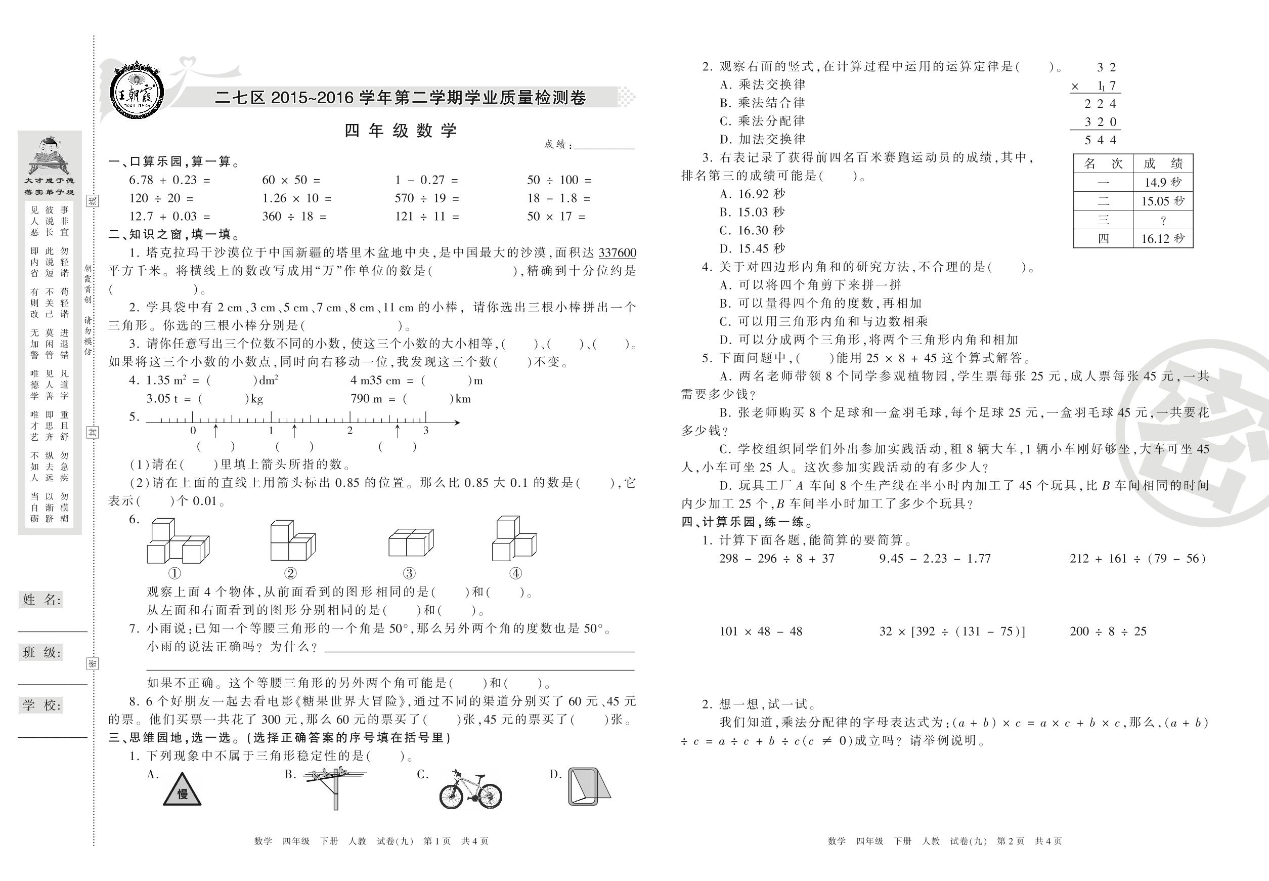 2015-2016学年第二学期郑州市二七区四年级数学试卷(人教版)【9】