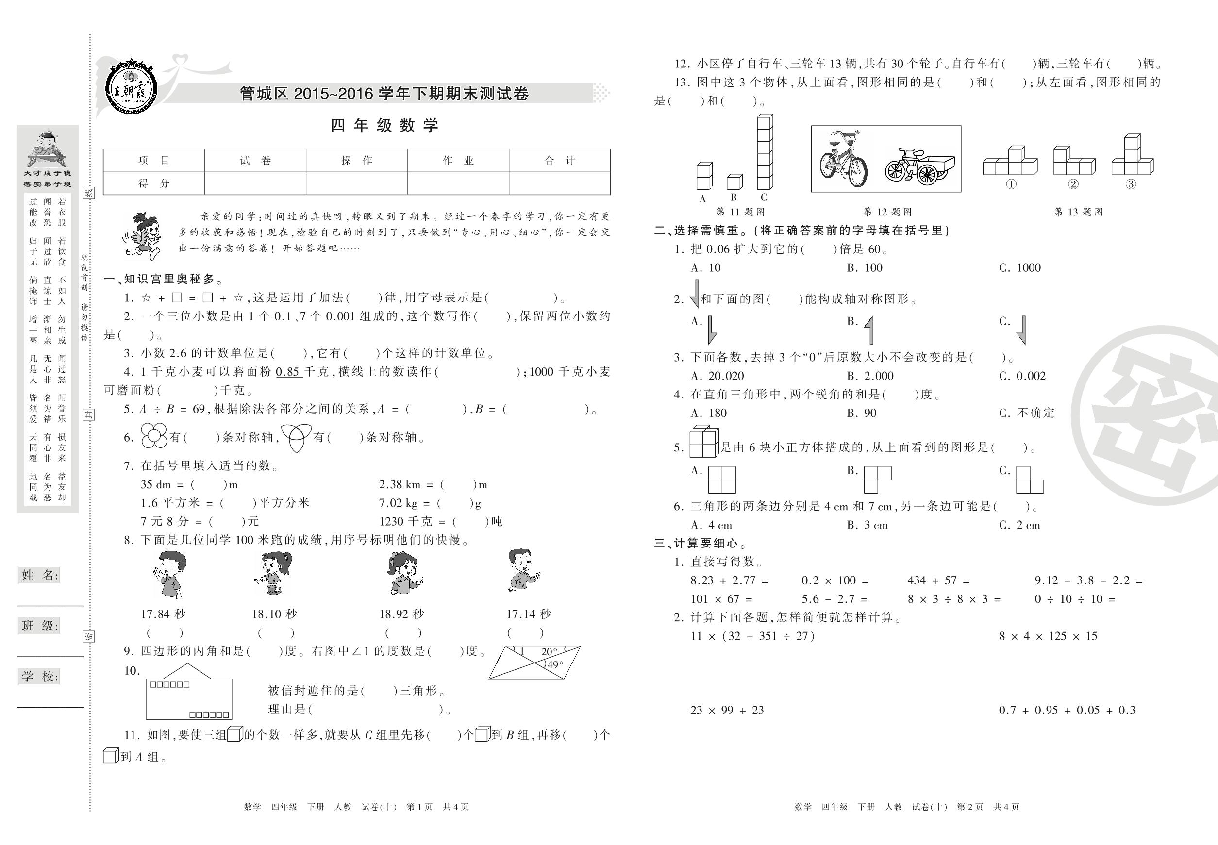 2015-2016学年第二学期郑州市管城区四年级数学试卷(人教版)【10】