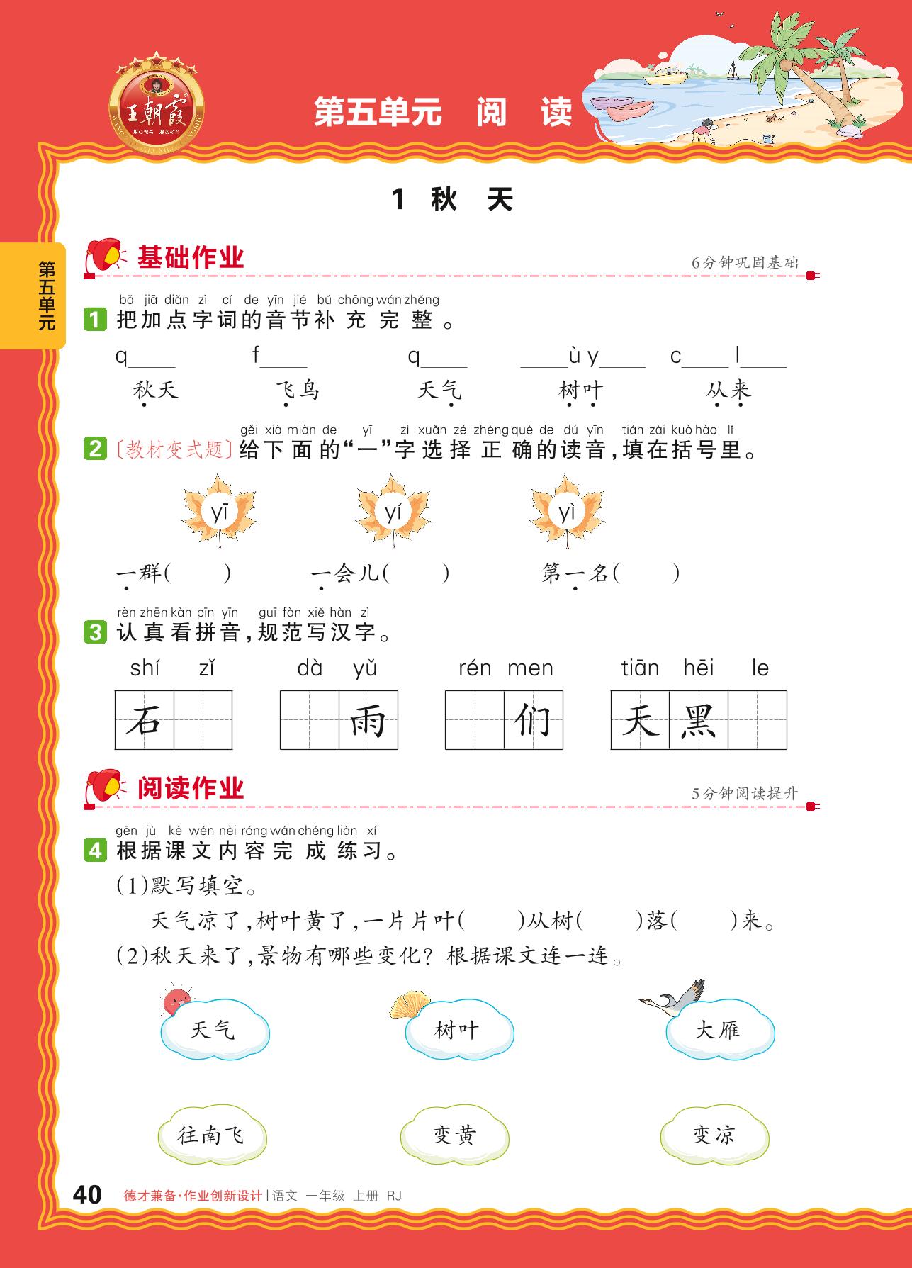2024秋上册一年级语文人教版 第五单元 阅读——1. 秋天