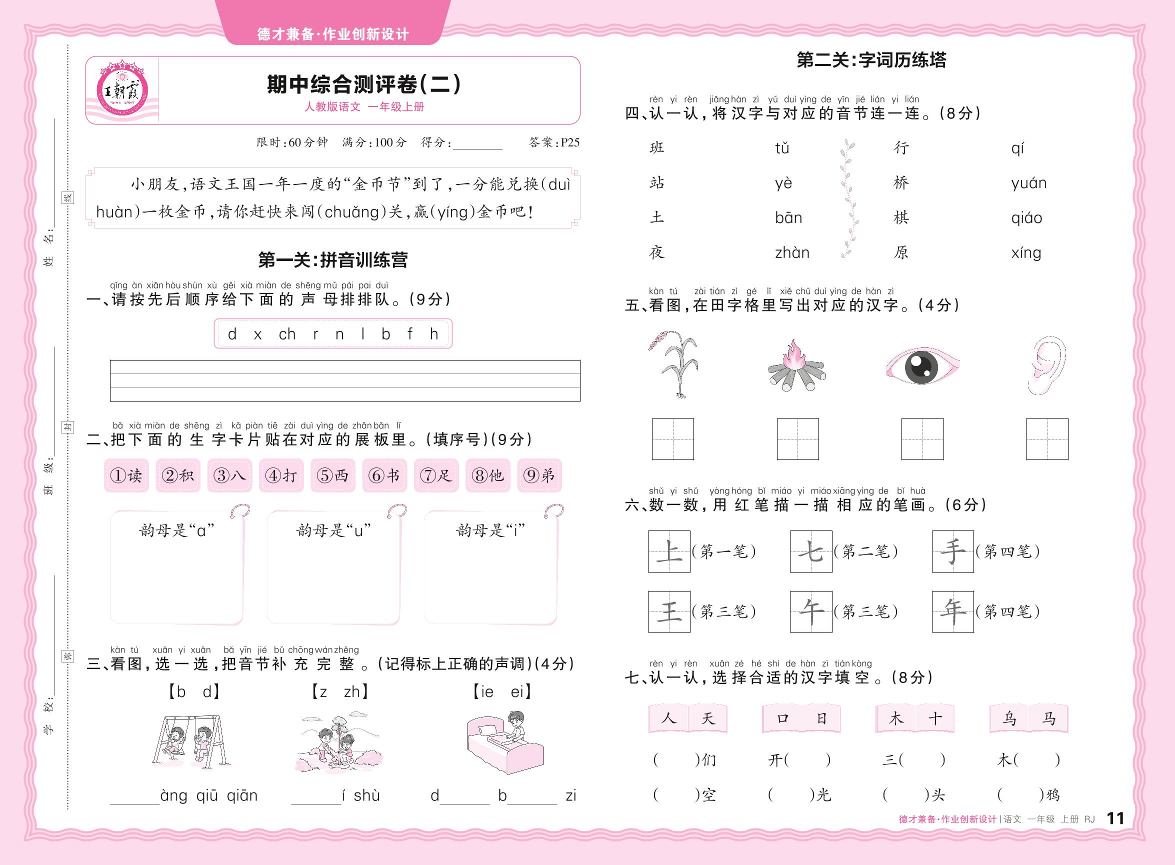 2024秋上册一年级语文人教版 期中综合测评卷(二)