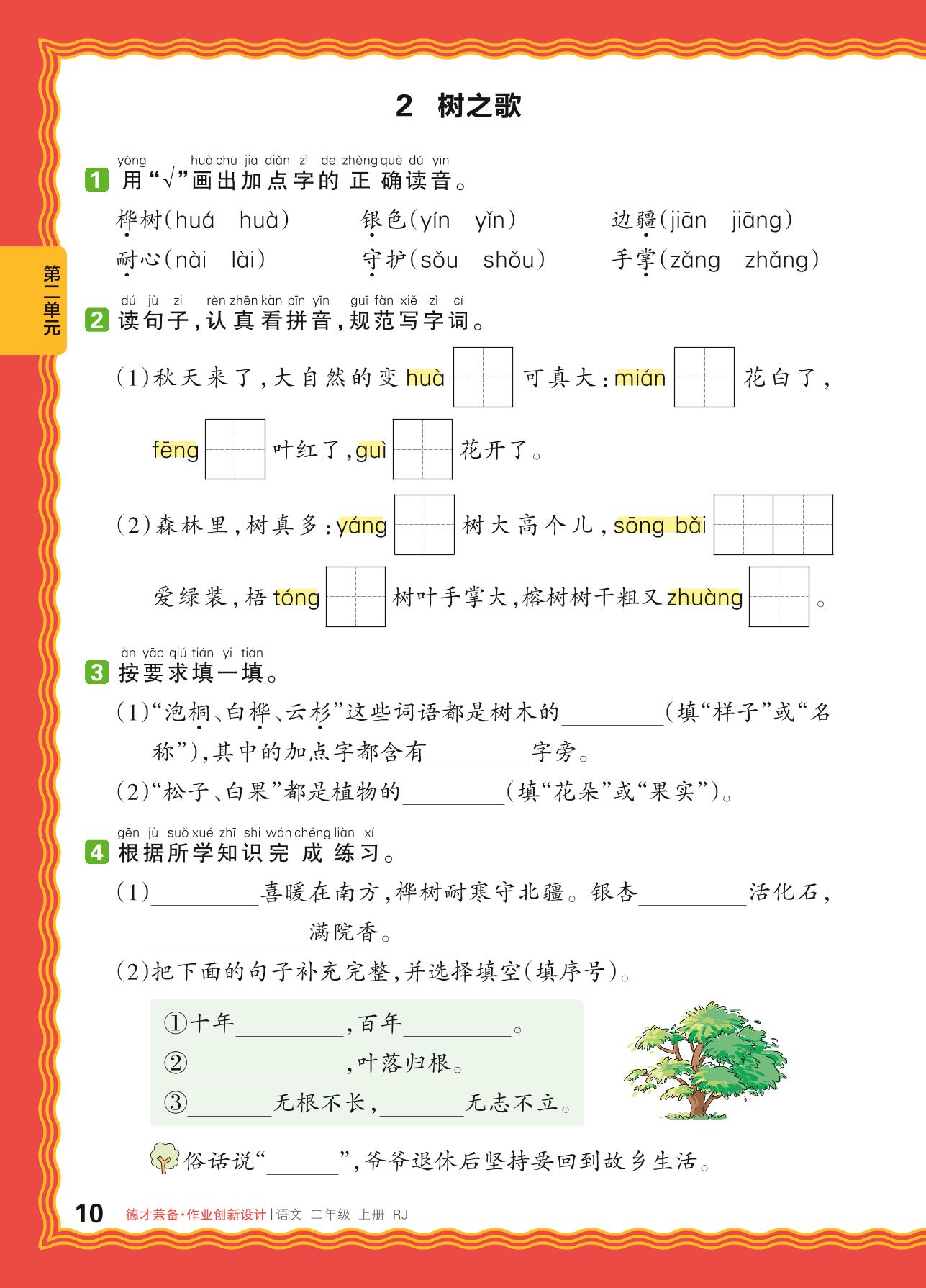 2024秋上册二年级语文人教版 第二单元 识字——2. 树之歌