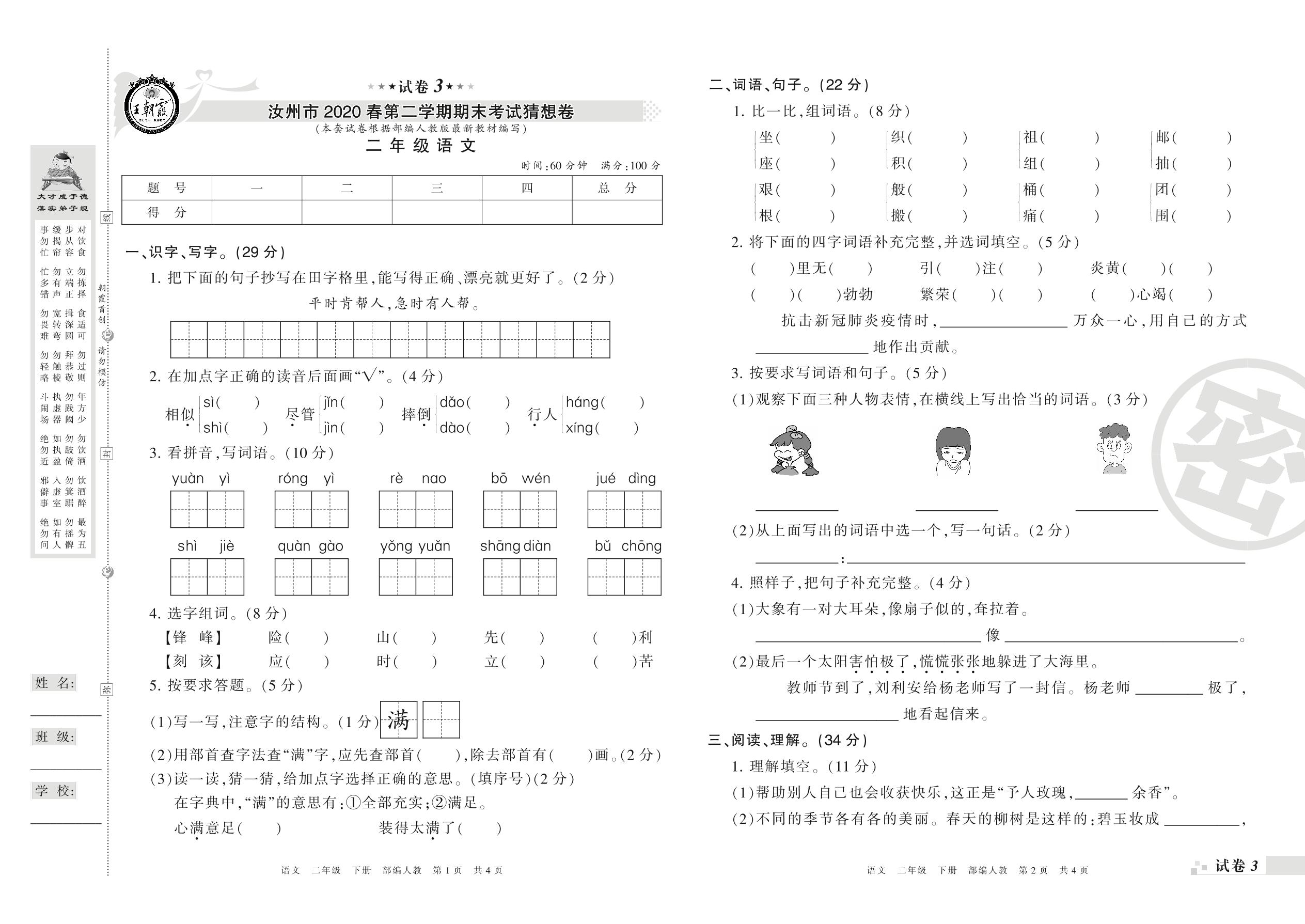 二年级语文人教版下册期末卷