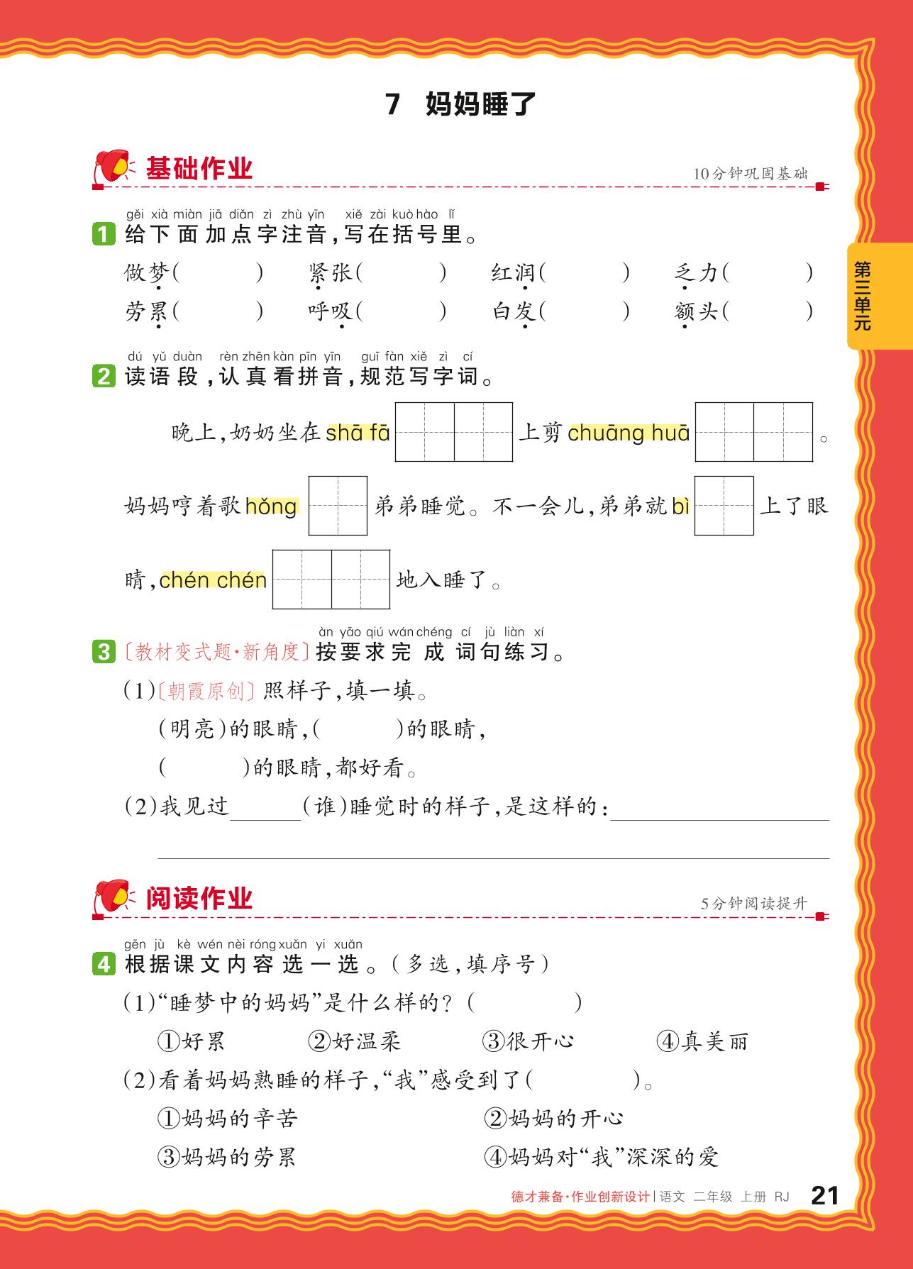 2024秋上册二年级语文人教版 第三单元 儿童生活——7. 妈妈睡了