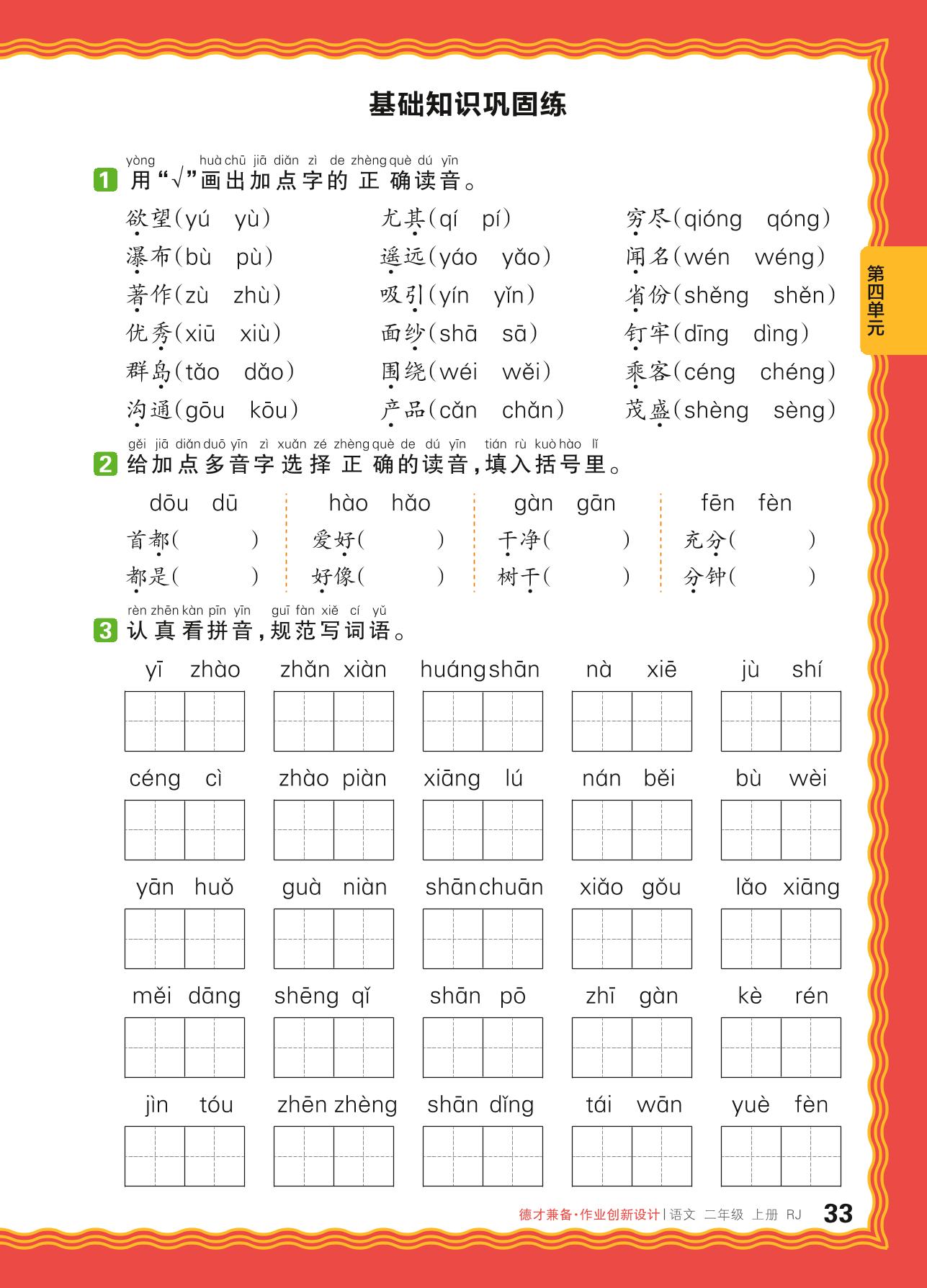 2024秋上册二年级语文人教版 第四单元 家乡——基础知识巩固练