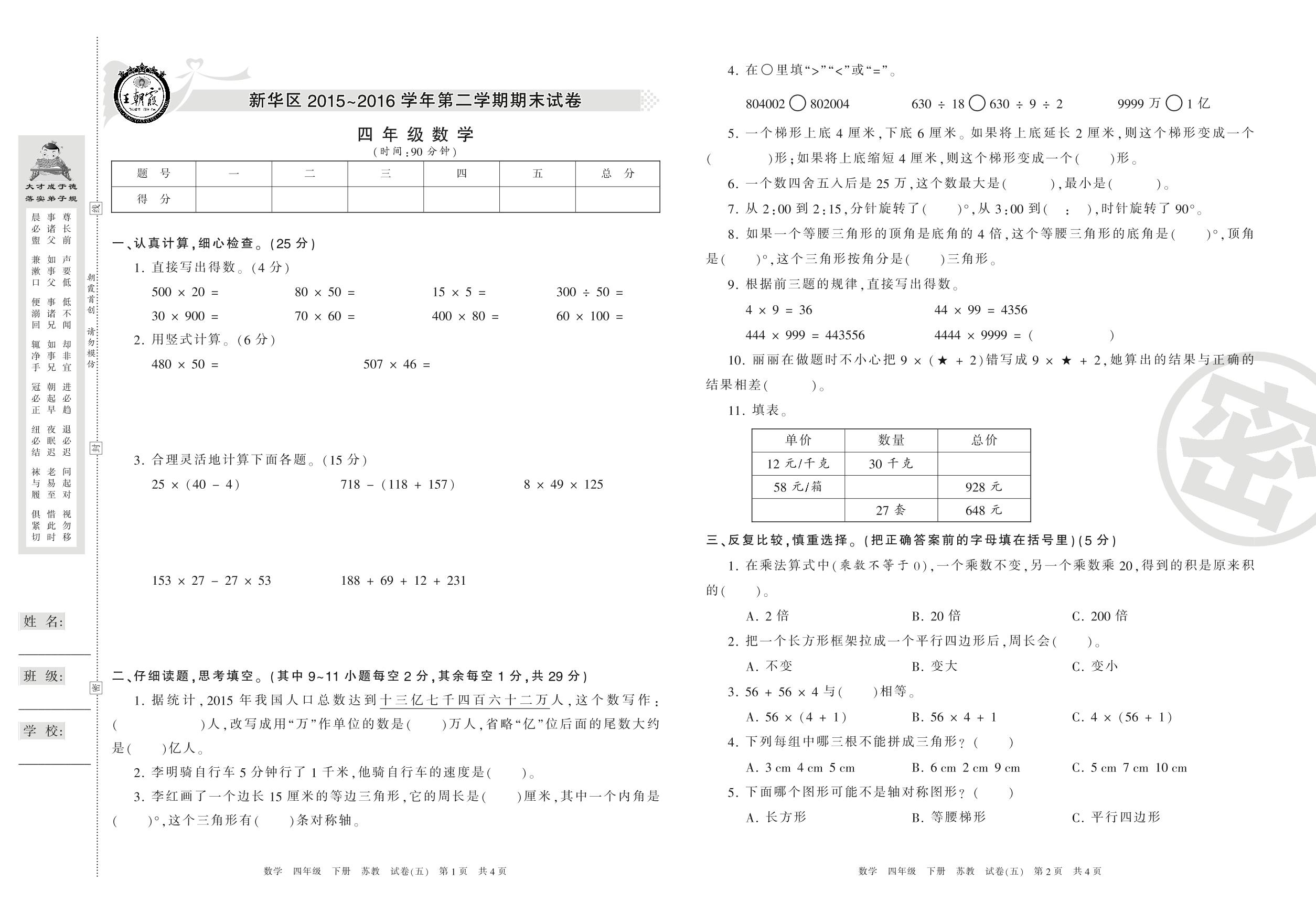 2015-2016学年第二学期平顶山市新华区四年级数学试卷(苏教版)【5】