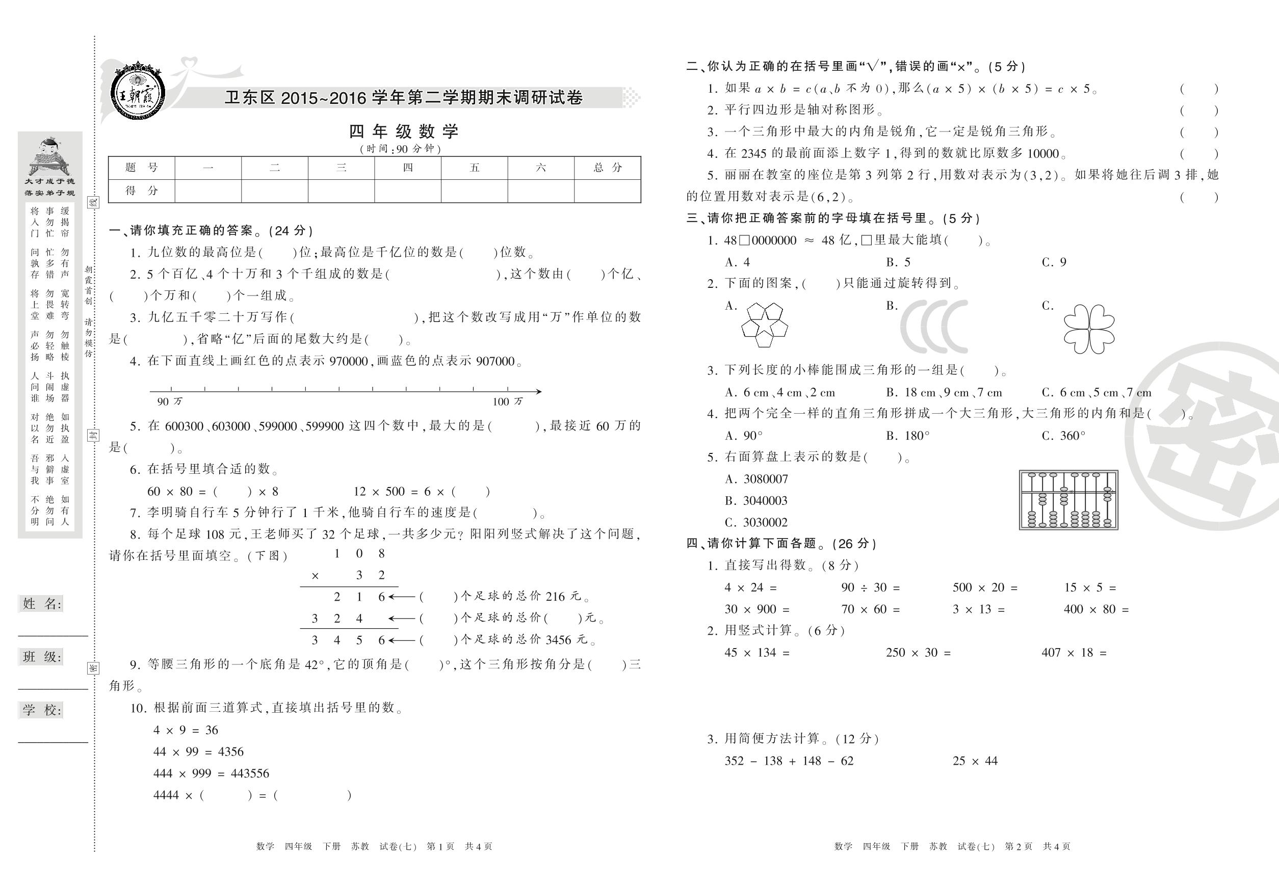 2015-2016学年第二学期卫东市四年级数学试卷(苏教版)【7】