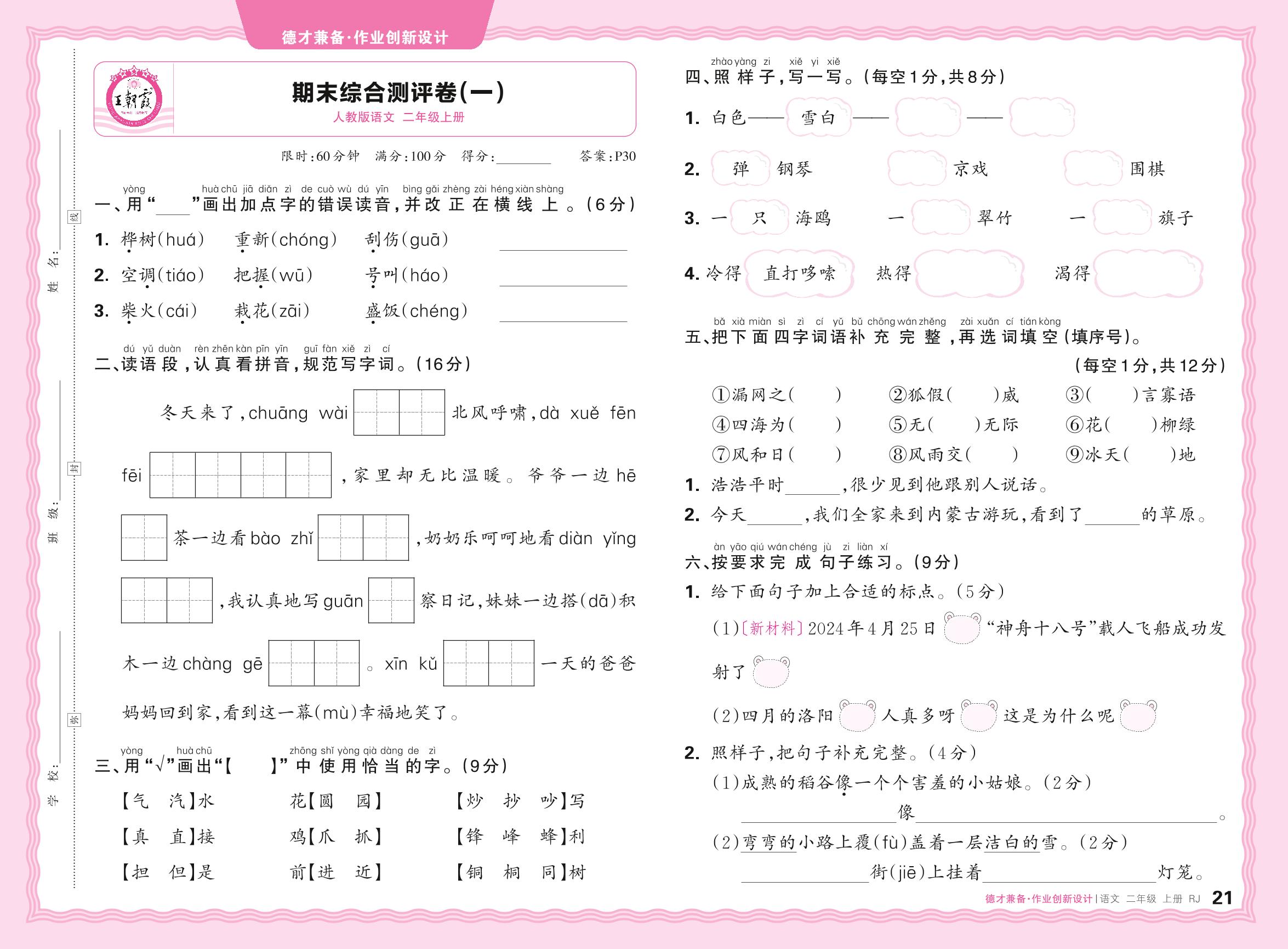 2024秋上册二年级语文人教版 期末综合测评卷(一)