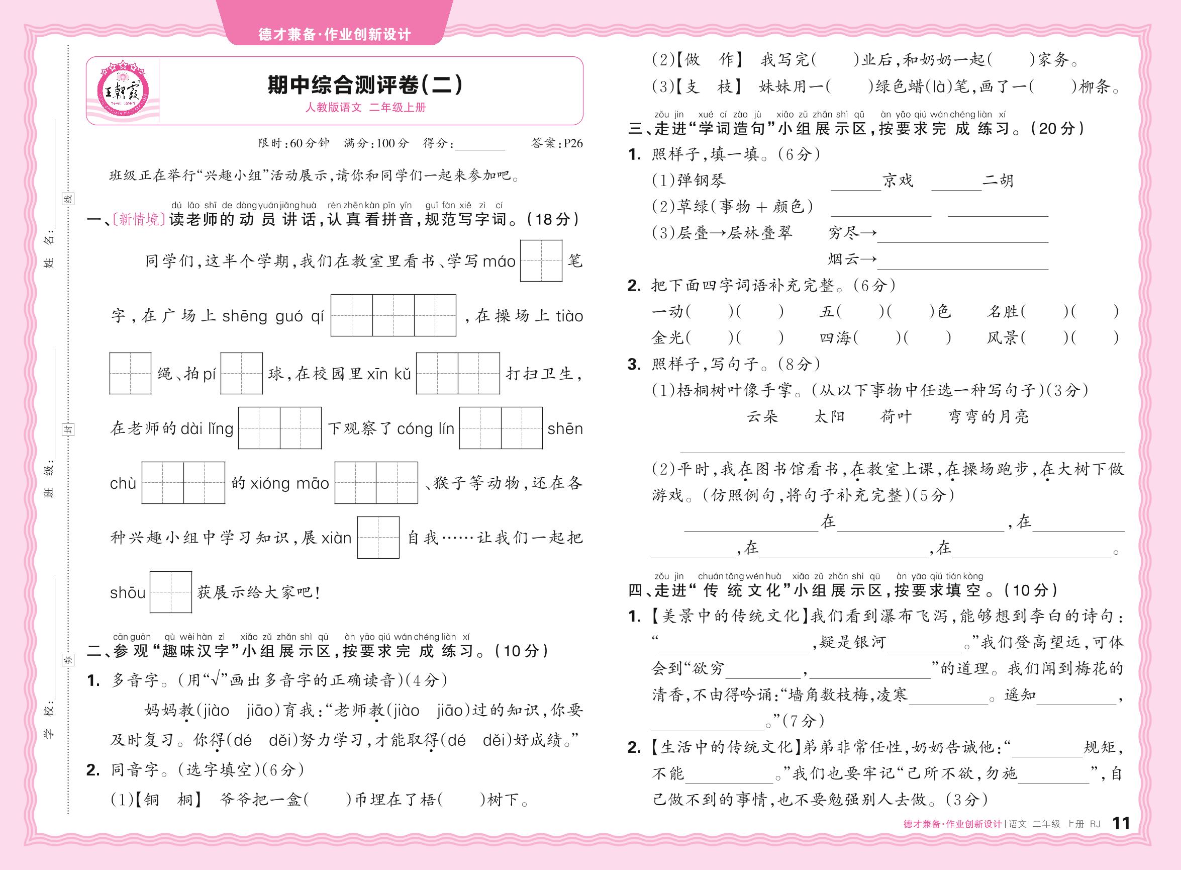 2024秋上册二年级语文人教版 期中综合测评卷(二)
