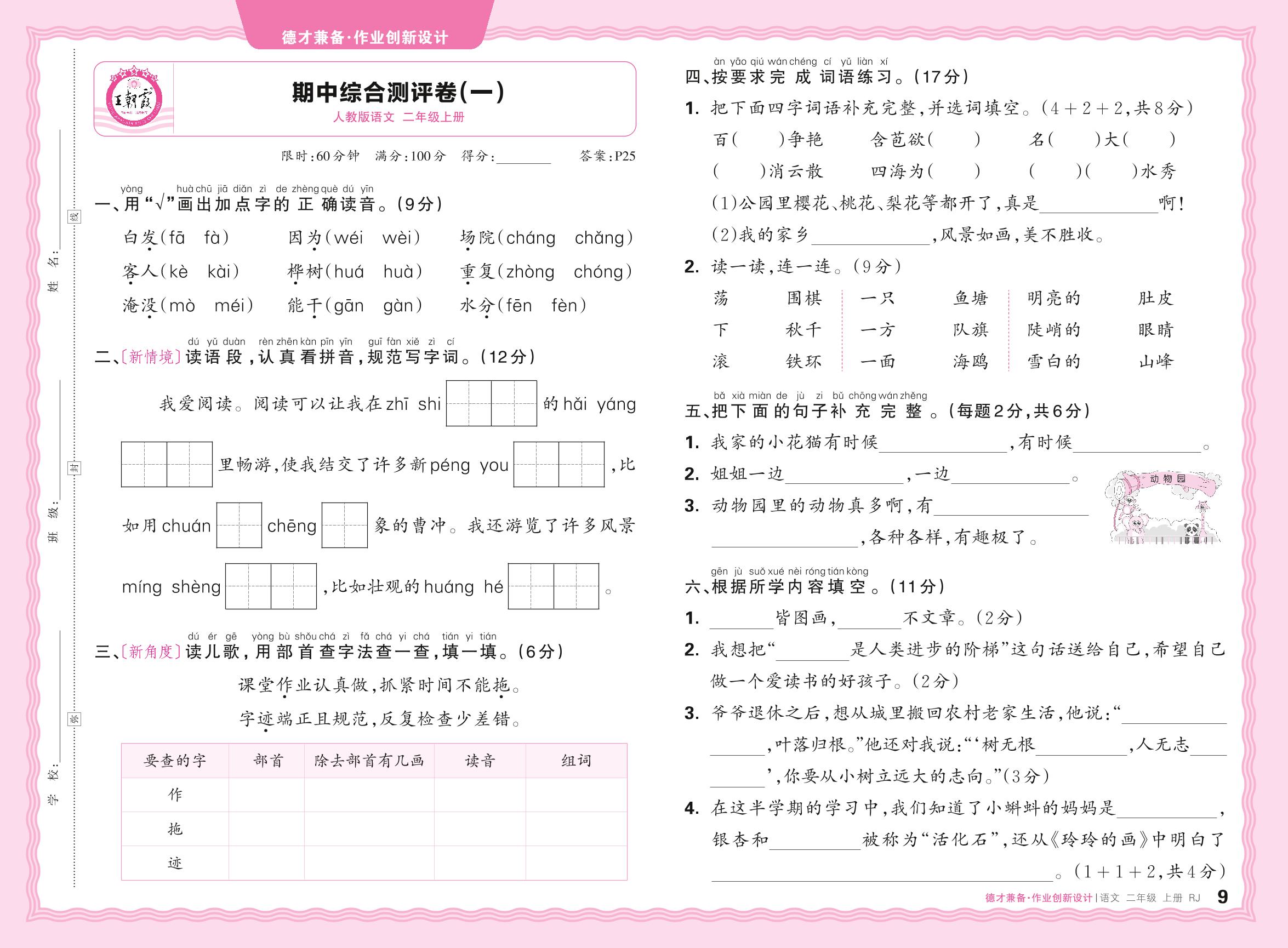 2024秋上册二年级语文人教版 期中综合测评卷(一)