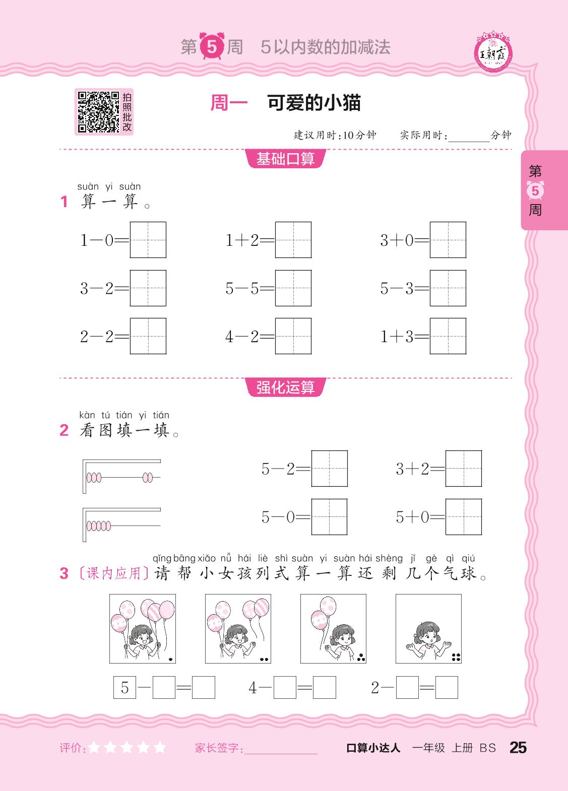 2024秋上册一年级数学北师版 口算计算专练 第5周