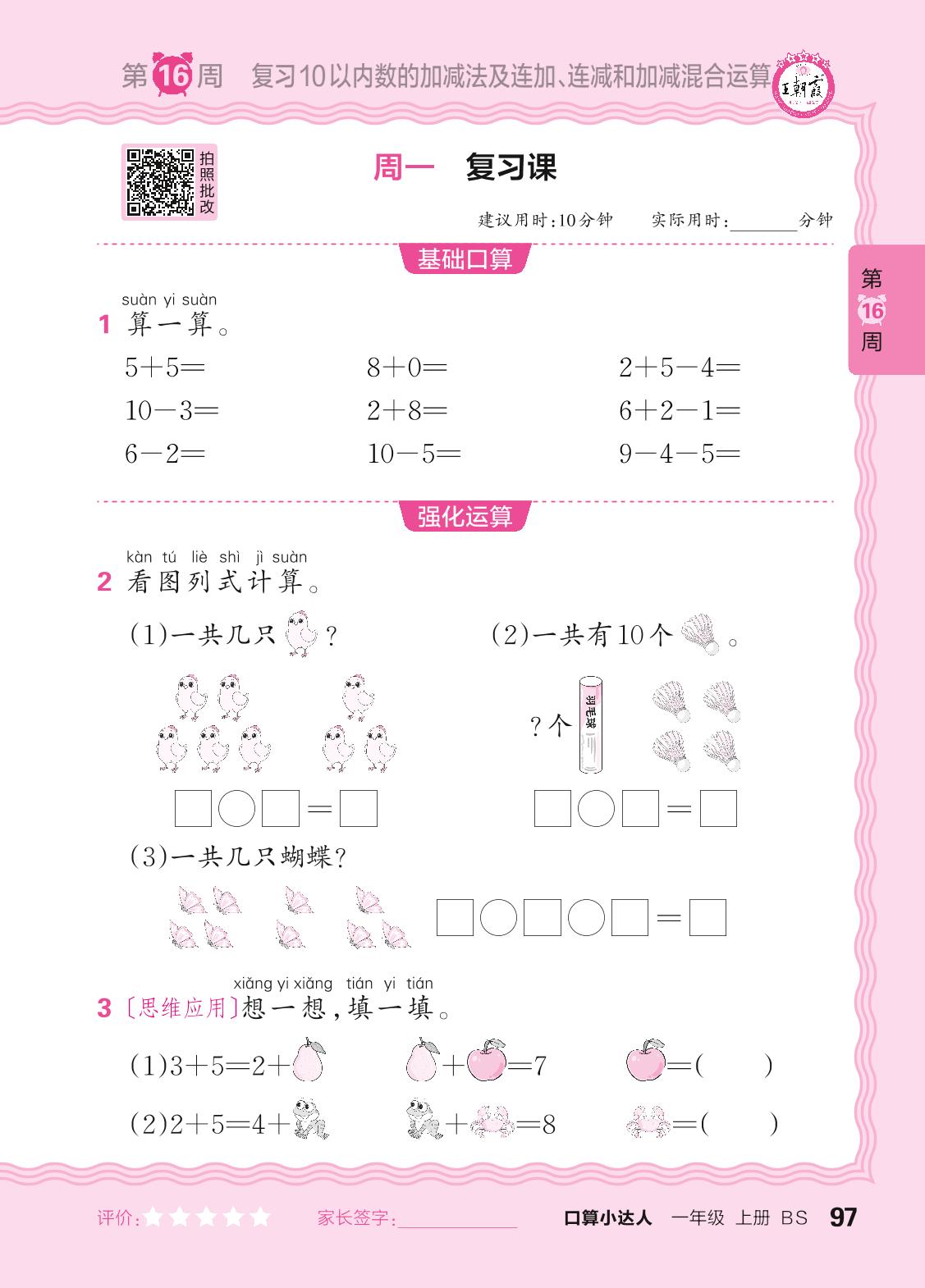 2024秋上册一年级数学北师版 口算计算专练 第16周