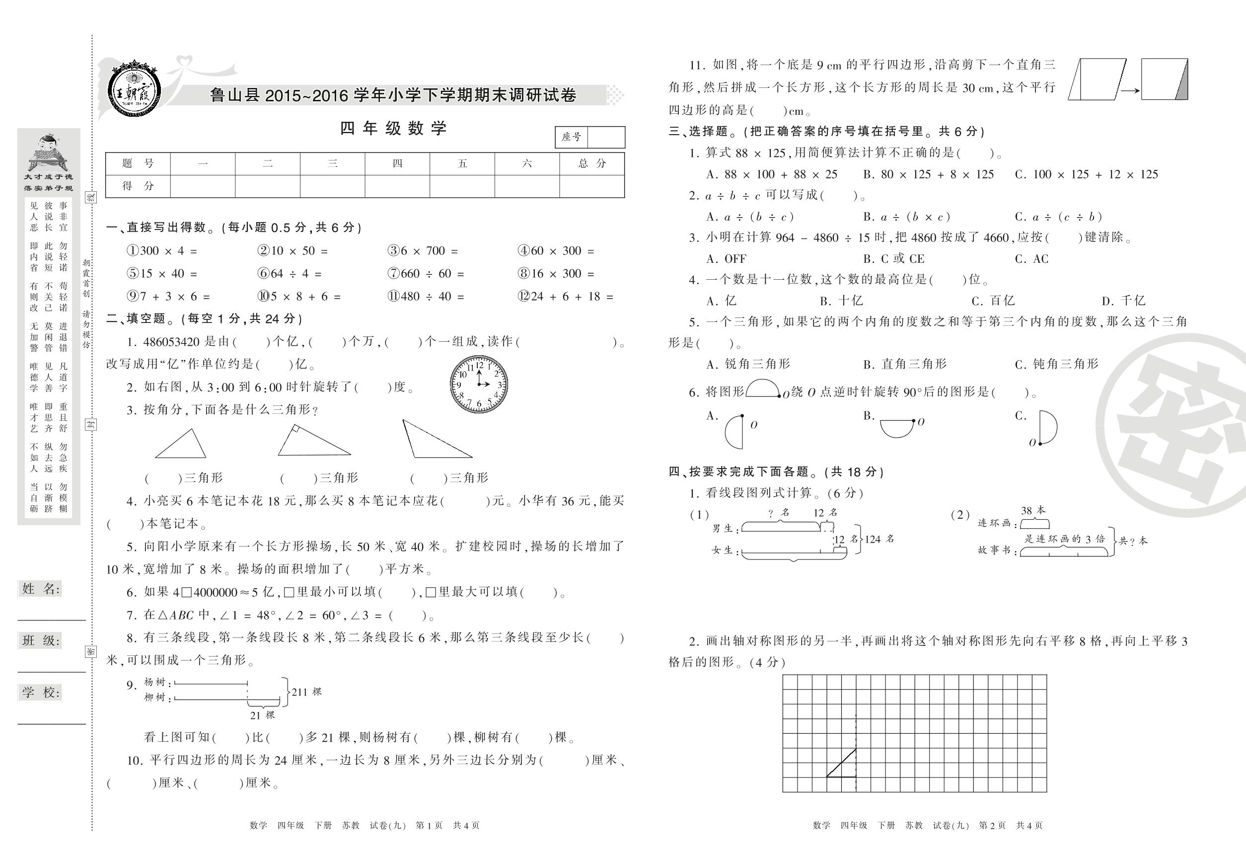 2015-2016学年第二学期平顶山市鲁山县四年级数学试卷(苏教版)【9】