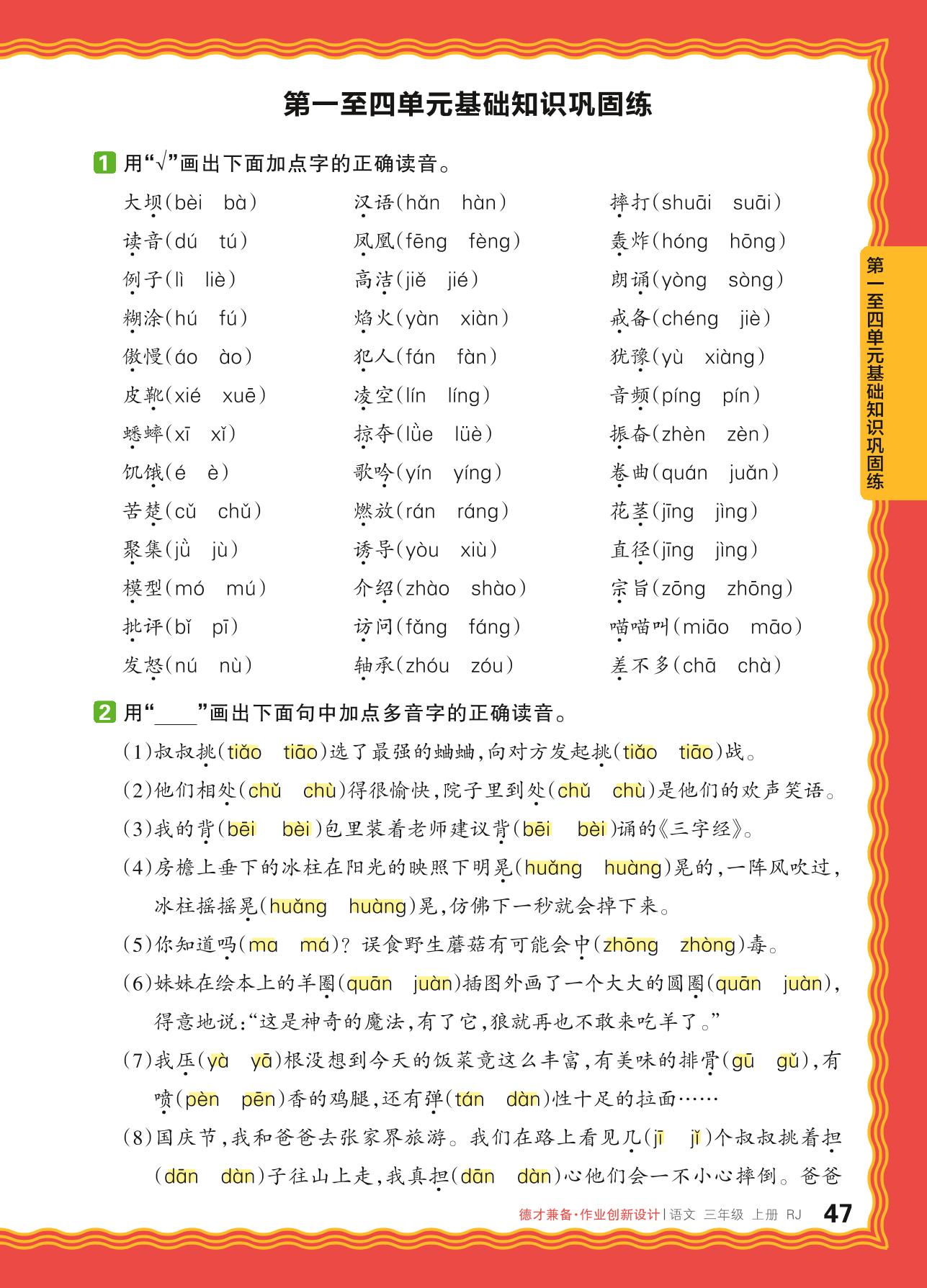 2024秋上册三年级语文人教版 第一至四单元基础知识巩固练