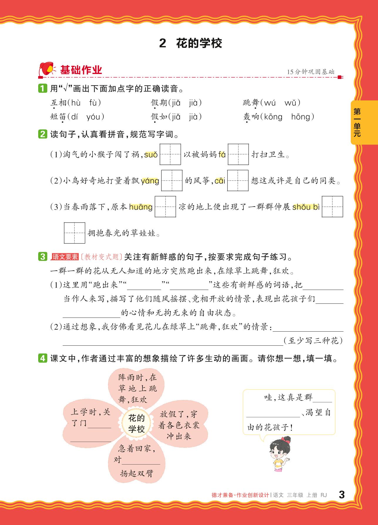2024秋上册三年级语文人教版 第一单元 学校生活——2. 花的学校