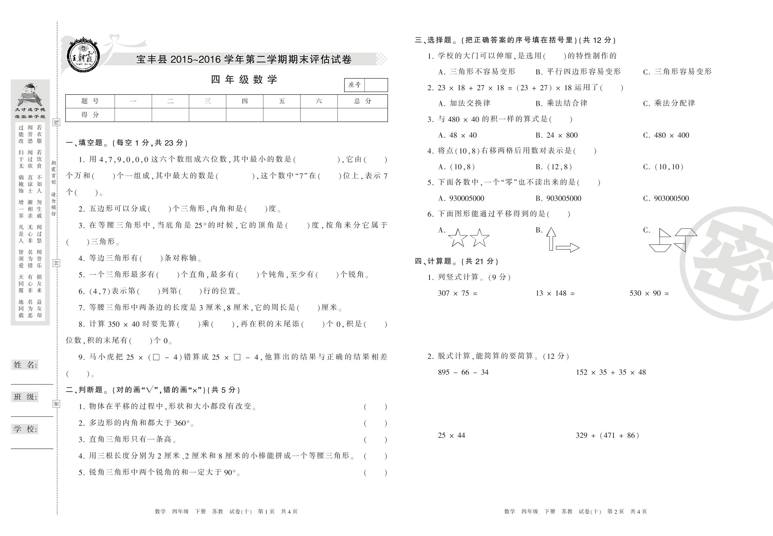 2015-2016学年第二学期平顶山市宝丰县四年级数学试卷(苏教版)【10】
