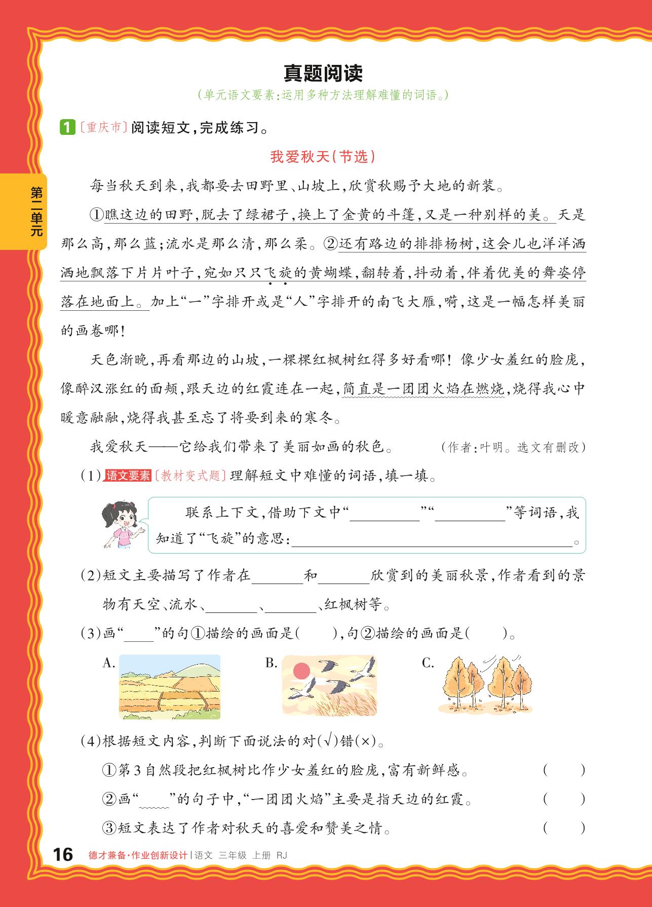 2024秋上册三年级语文人教版 第二单元 金秋时节——真题阅读