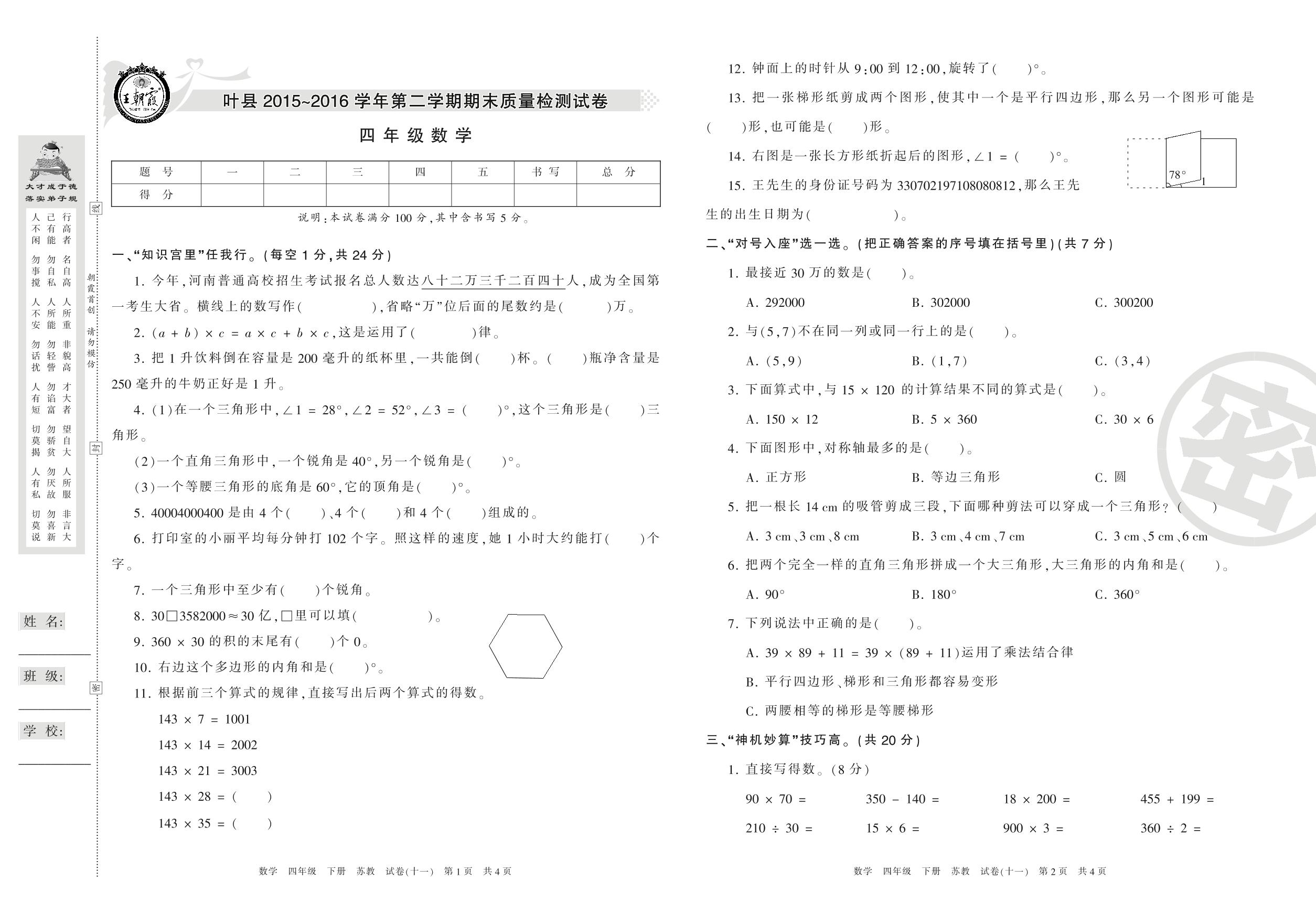2015-2016学年第二学期平顶山市叶县四年级数学试卷(苏教版)【11】