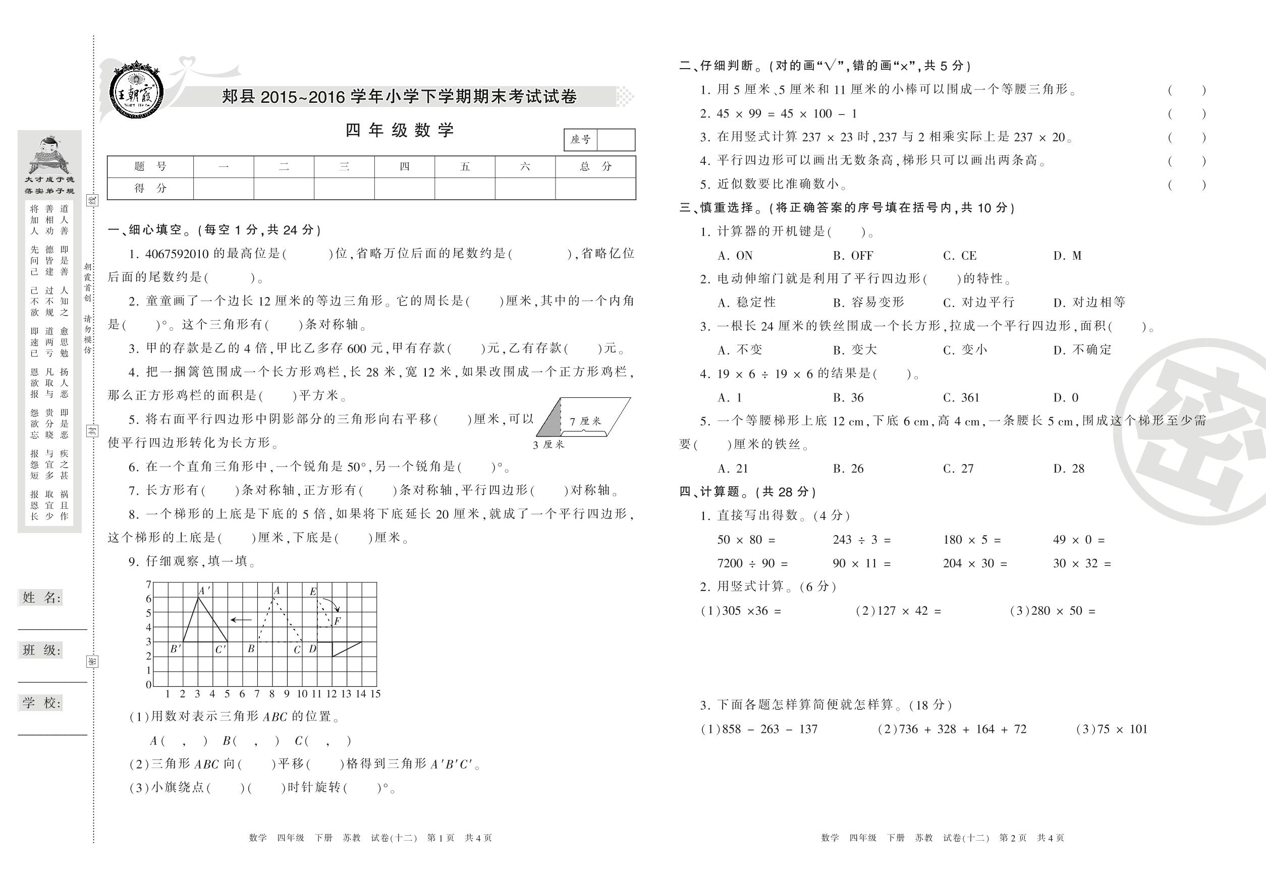 2015-2016学年第二学期平顶山市郏县四年级数学试卷(苏教版)【12】