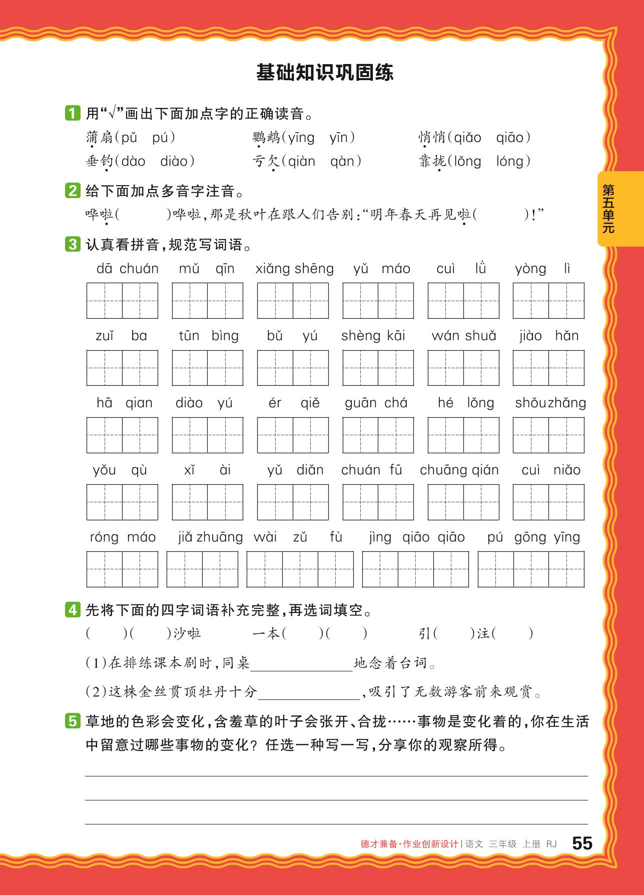 2024秋上册三年级语文人教版 第五单元 留心观察——基础知识巩固练