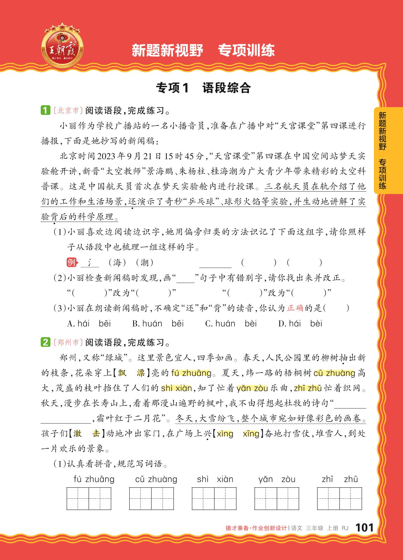 2024秋上册三年级语文人教版 新题新视野 专项训练——语段综合【1】