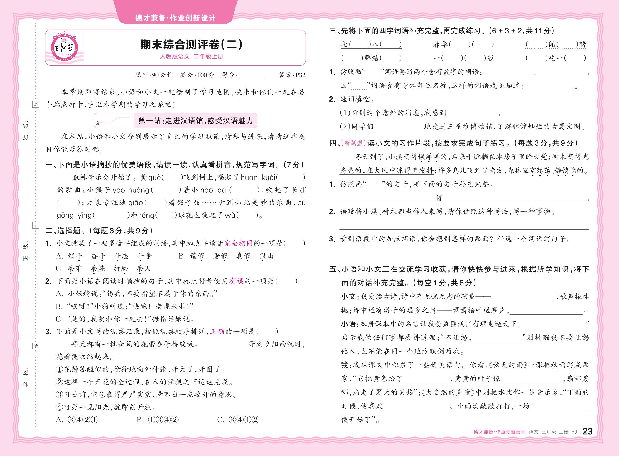 2024秋上册三年级语文人教版 期末综合测评卷(二)