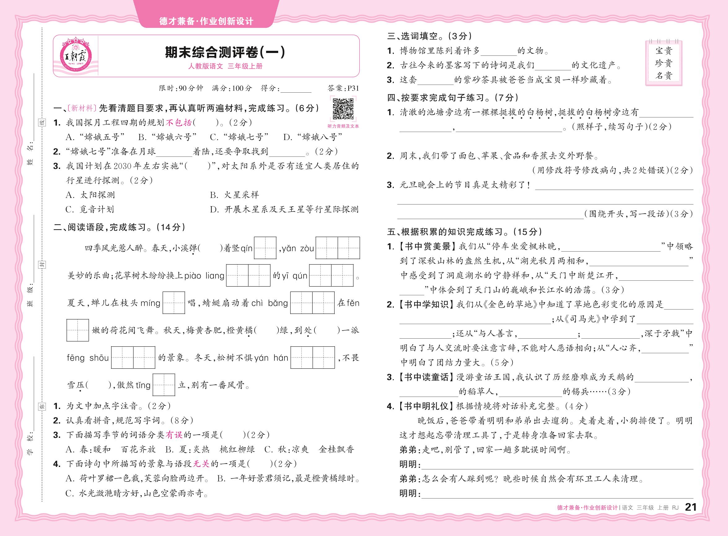 2024秋上册三年级语文人教版 期末综合测评卷(一)